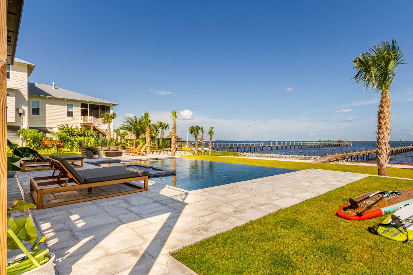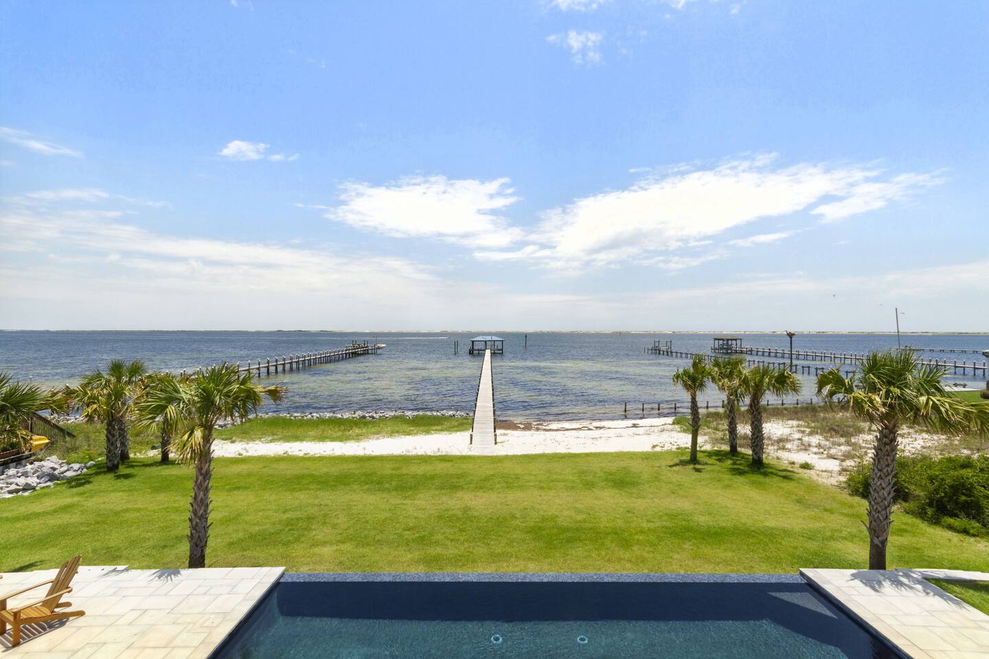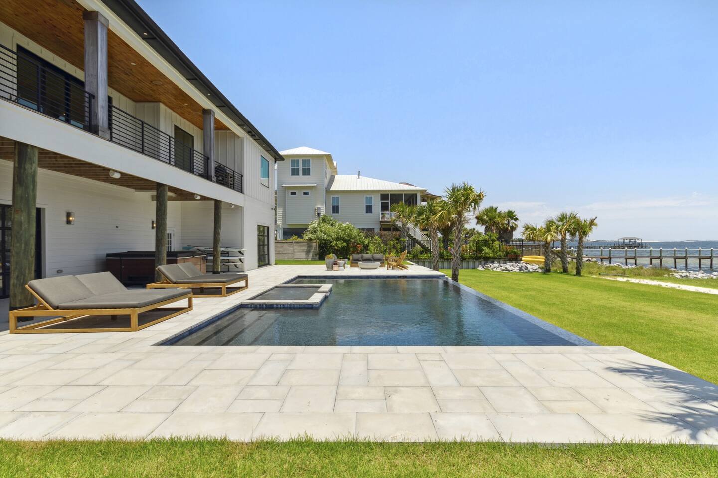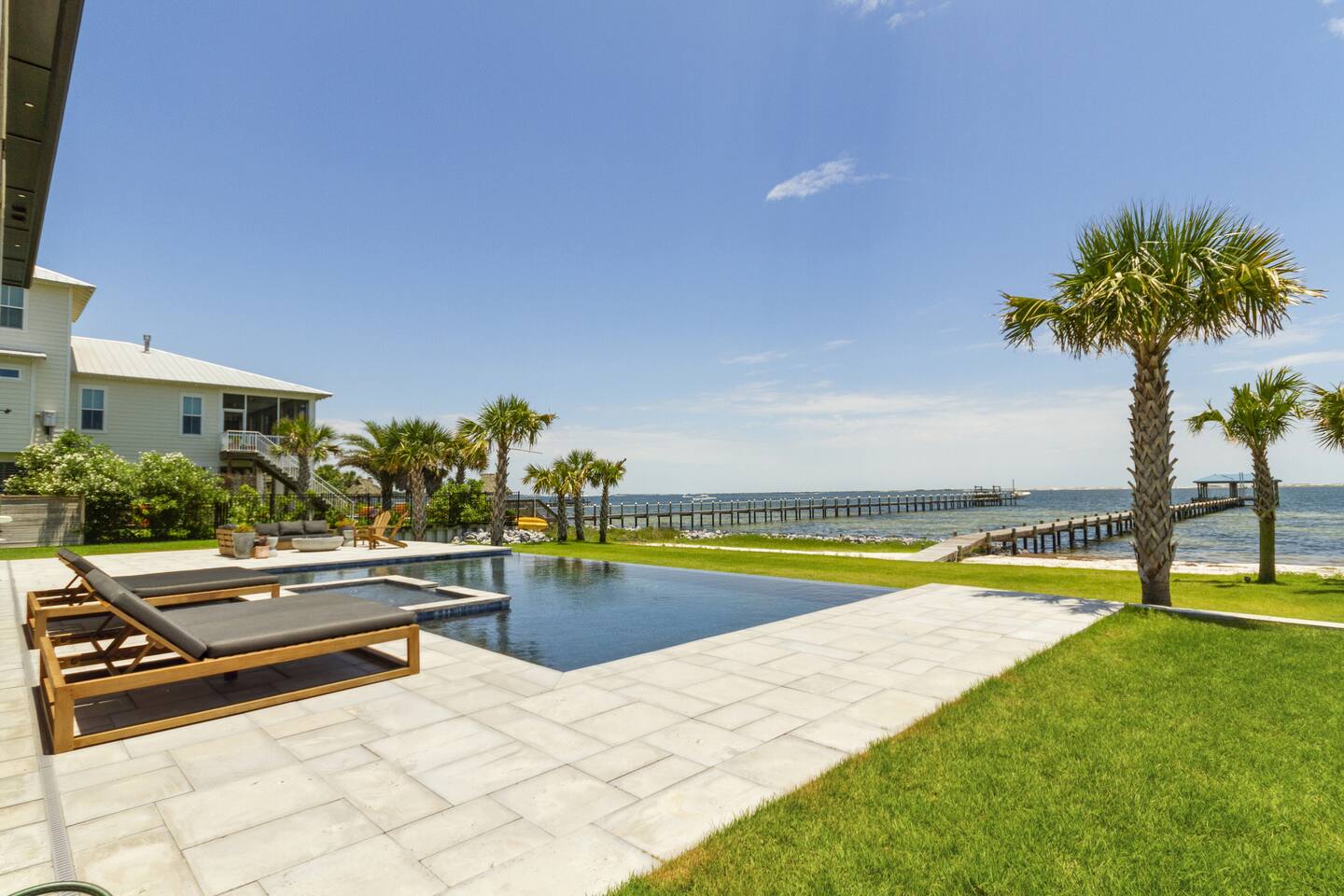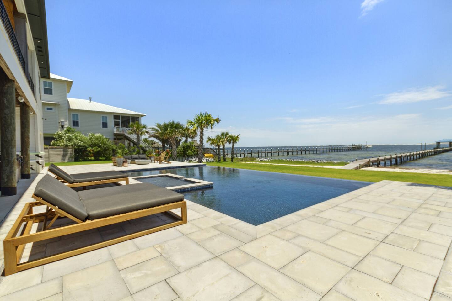 Our stunning 5000 square foot new waterfront home features open concept living at its finest. The spacious gourmet kitchen is equipped with a Big Green Egg and Blackstone grilling options, providing everything you need for cooking a gourmet meal. The beautiful living room offers a gas fireplace, flat screen TV, and comfy seating. The home includes four spacious bedrooms with luxury bedding and large picture windows. The master ensuite bath looks like it should be in a magazine, with its beautiful tadelakt walls, walk-in shower with teak floors, and garden tub, as well as an electric fireplace in the master suite. The property also features a stunning private office, a baby grand piano, and a boat slip to tie up your boat. If you are lucky enough to stay at our home on Tuesdays or Thursdays, you may even get to see the Blue Angels practice overhead. It's an amazing sight to see and hear. Additionally, you won't want to miss the frequent dolphins that pass by. Watch for them in the early mornings and evenings.