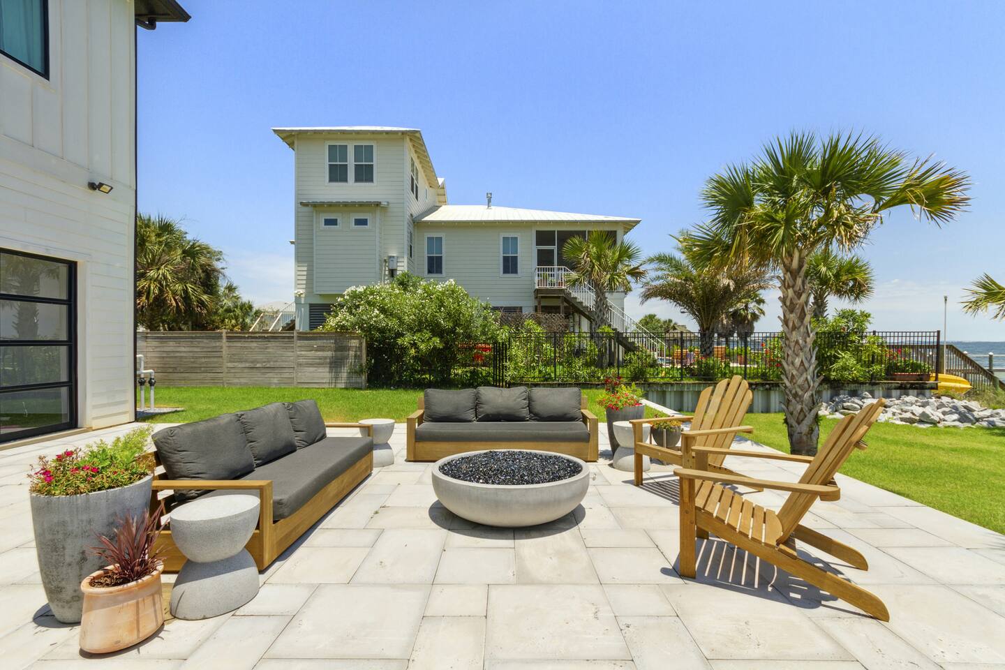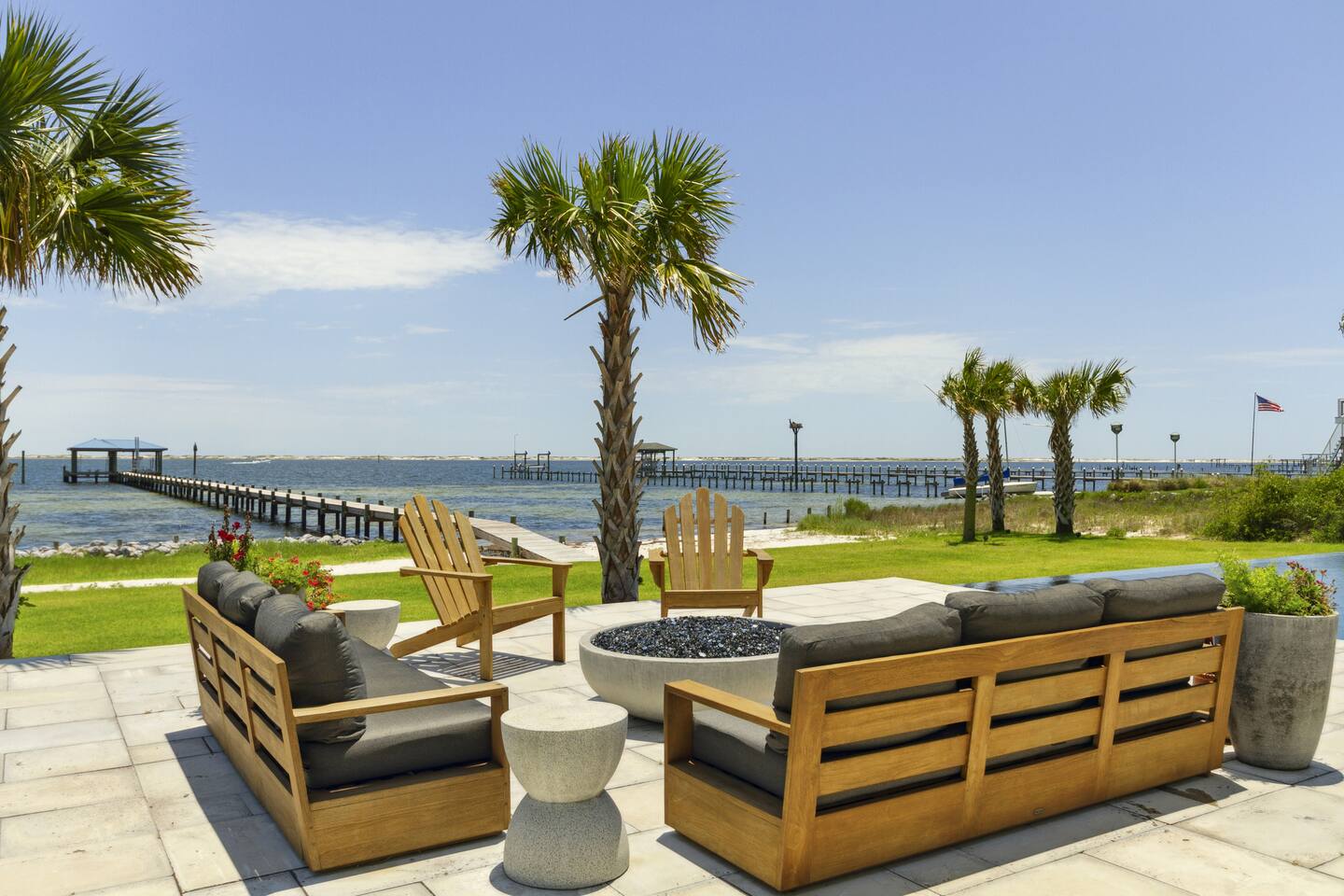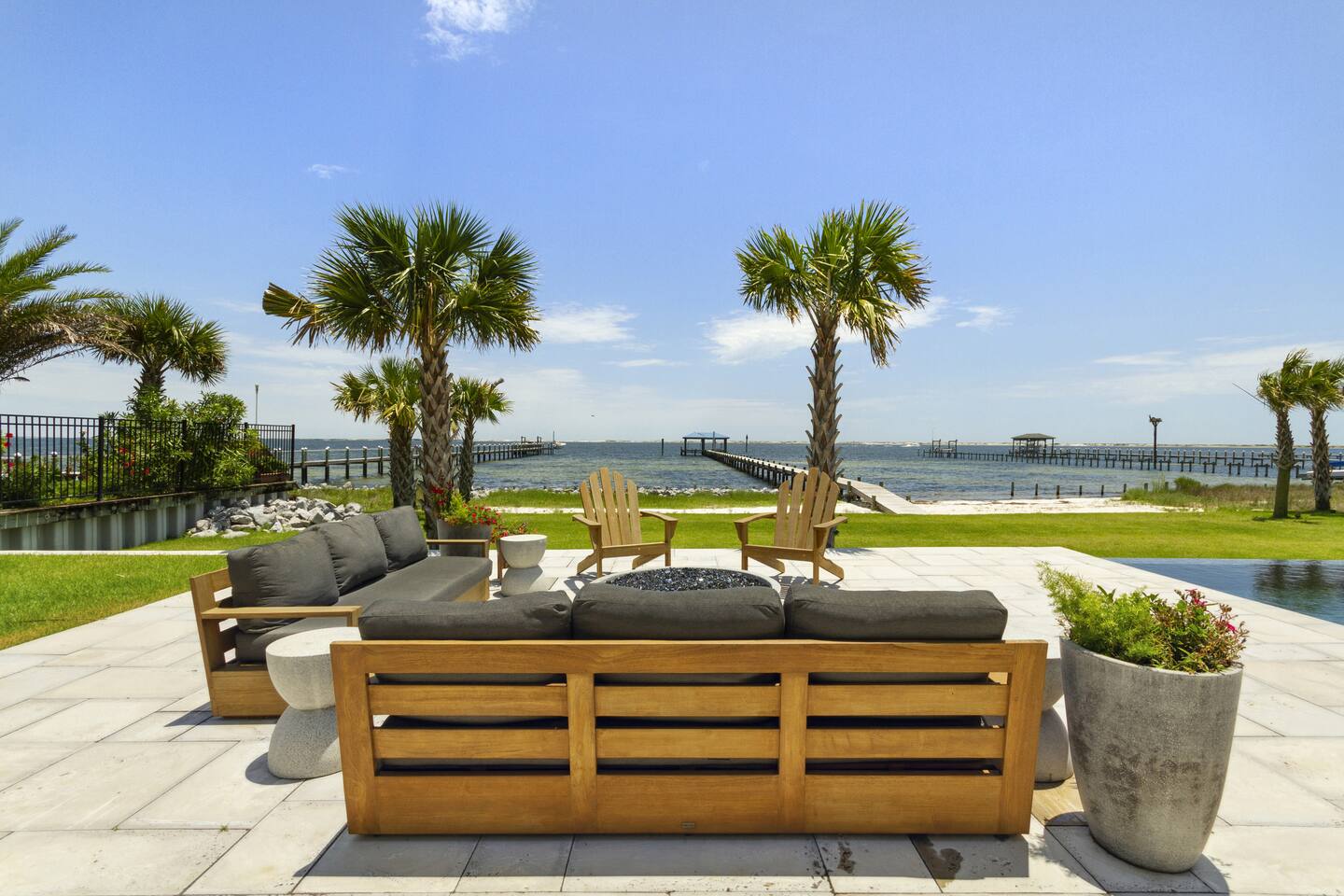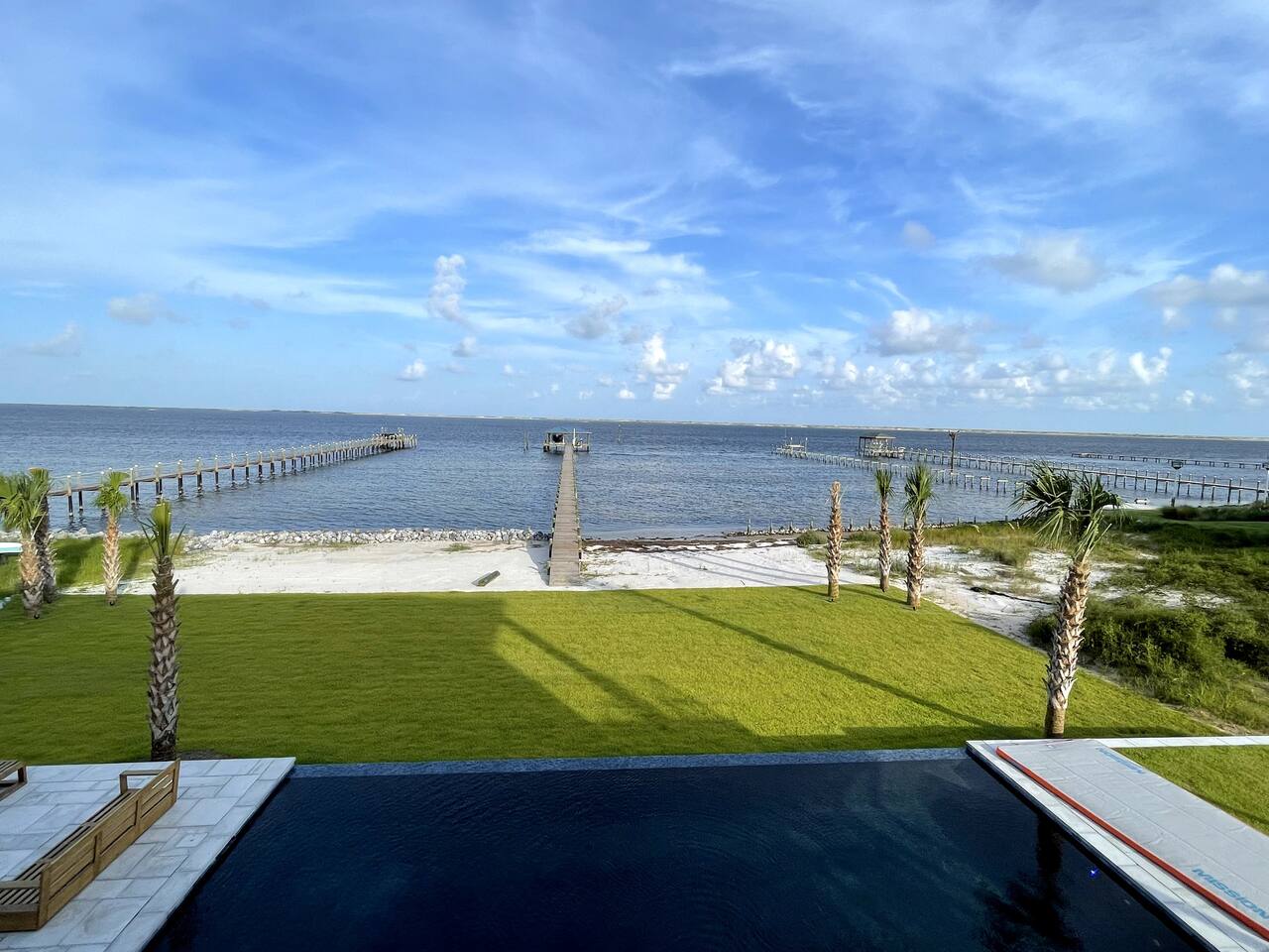 Our stunning 5000 square foot new waterfront home features open concept living at its finest. The spacious gourmet kitchen is equipped with a Big Green Egg and Blackstone grilling options, providing everything you need for cooking a gourmet meal. The beautiful living room offers a gas fireplace, flat screen TV, and comfy seating. The home includes four spacious bedrooms with luxury bedding and large picture windows. The master ensuite bath looks like it should be in a magazine, with its beautiful tadelakt walls, walk-in shower with teak floors, and garden tub, as well as an electric fireplace in the master suite. The property also features a stunning private office, a baby grand piano, and a boat slip to tie up your boat. If you are lucky enough to stay at our home on Tuesdays or Thursdays, you may even get to see the Blue Angels practice overhead. It's an amazing sight to see and hear. Additionally, you won't want to miss the frequent dolphins that pass by. Watch for them in the early mornings and evenings.