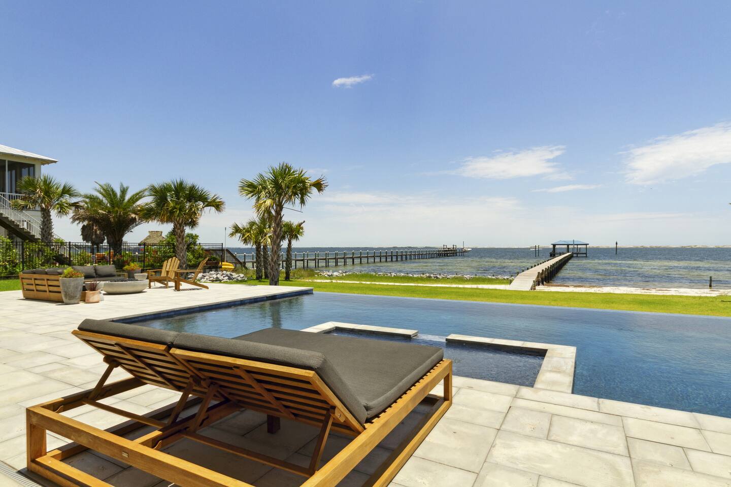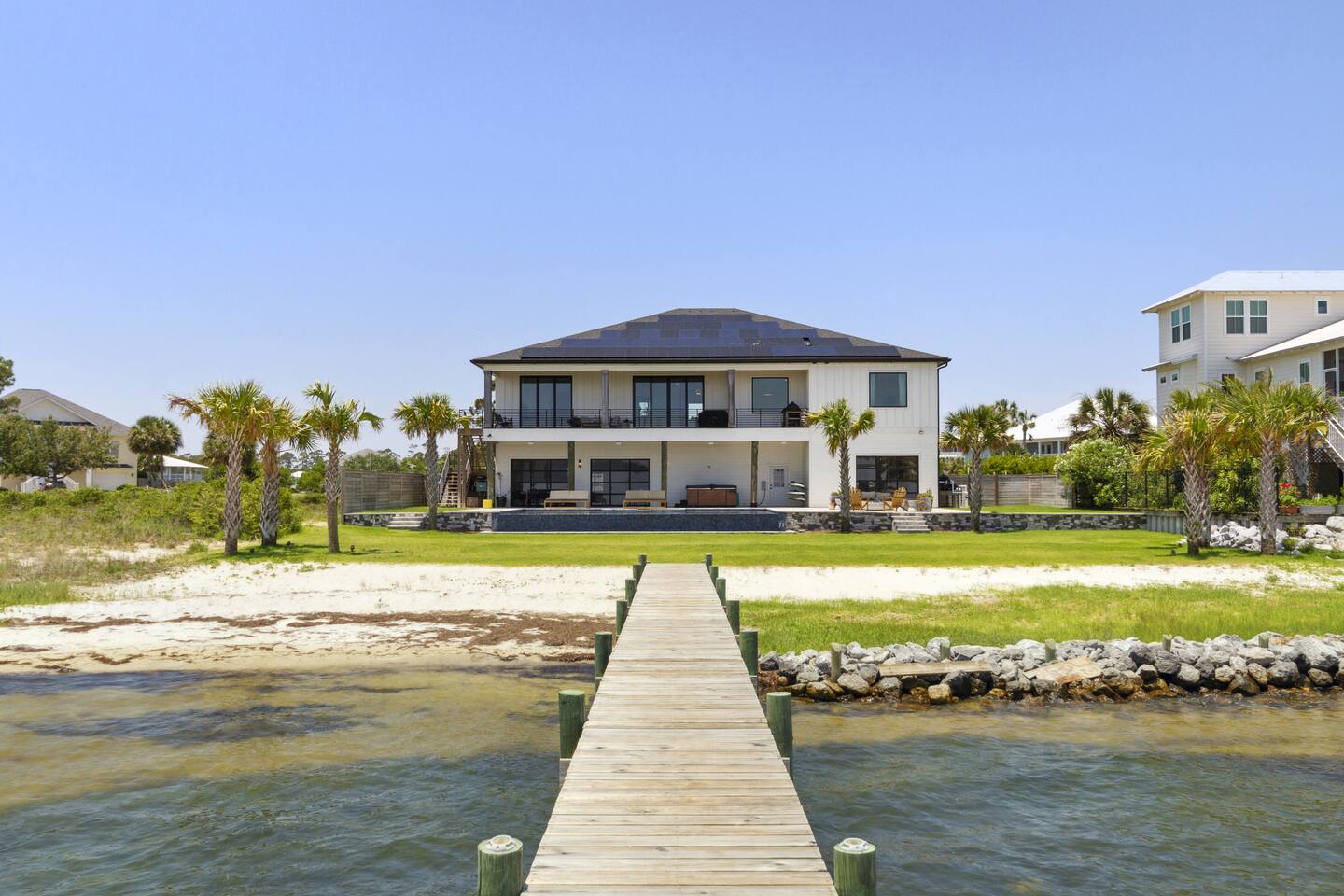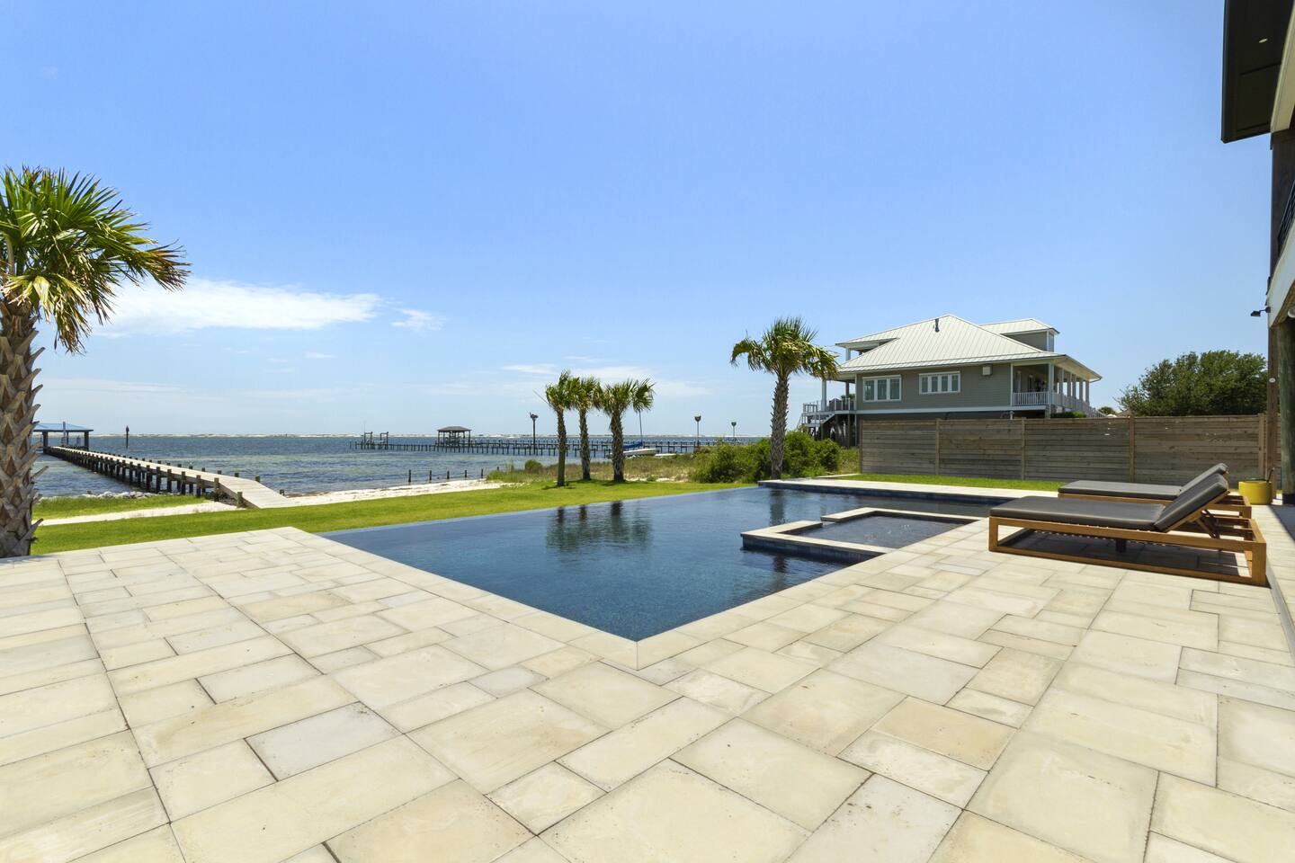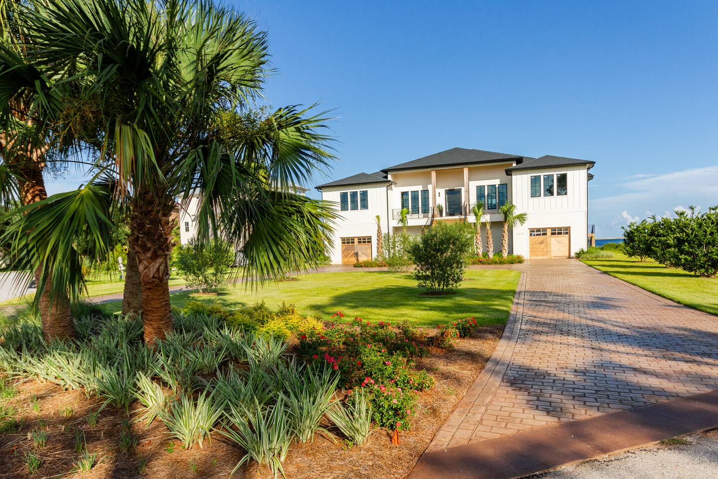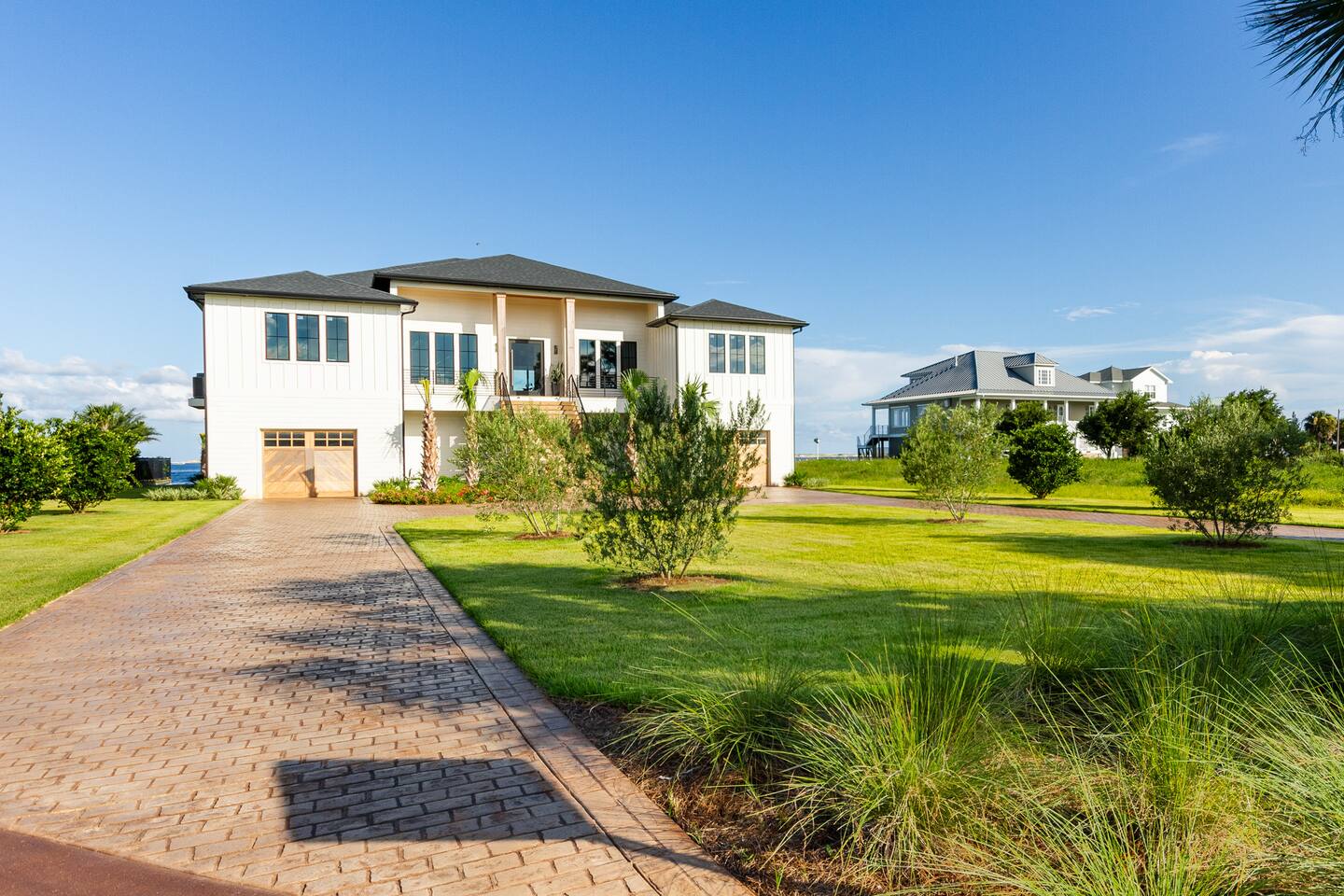 Our stunning 5000 square foot new waterfront home features open concept living at its finest. The spacious gourmet kitchen is equipped with a Big Green Egg and Blackstone grilling options, providing everything you need for cooking a gourmet meal. The beautiful living room offers a gas fireplace, flat screen TV, and comfy seating. The home includes four spacious bedrooms with luxury bedding and large picture windows. The master ensuite bath looks like it should be in a magazine, with its beautiful tadelakt walls, walk-in shower with teak floors, and garden tub, as well as an electric fireplace in the master suite. The property also features a stunning private office, a baby grand piano, and a boat slip to tie up your boat. If you are lucky enough to stay at our home on Tuesdays or Thursdays, you may even get to see the Blue Angels practice overhead. It's an amazing sight to see and hear. Additionally, you won't want to miss the frequent dolphins that pass by. Watch for them in the early mornings and evenings.