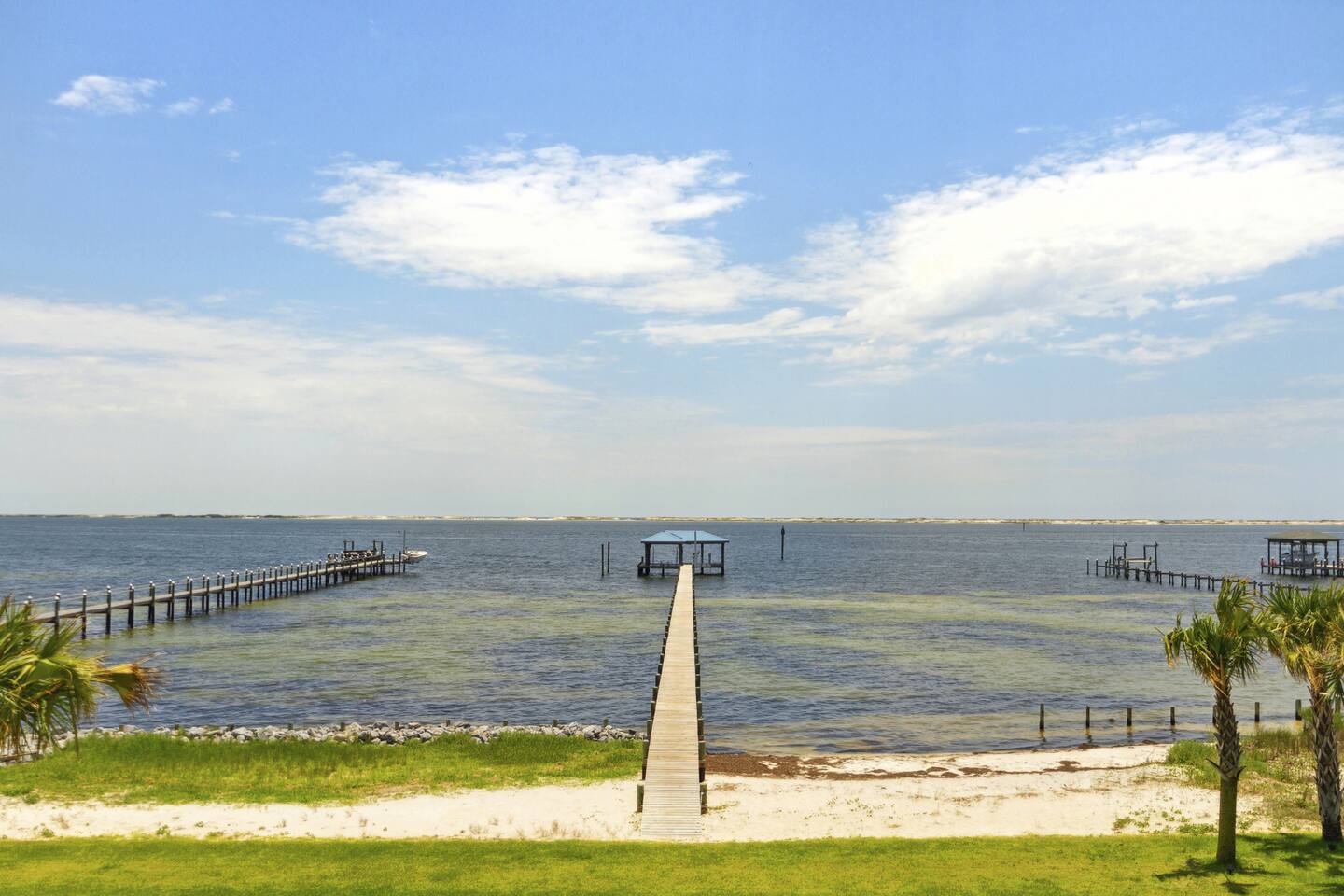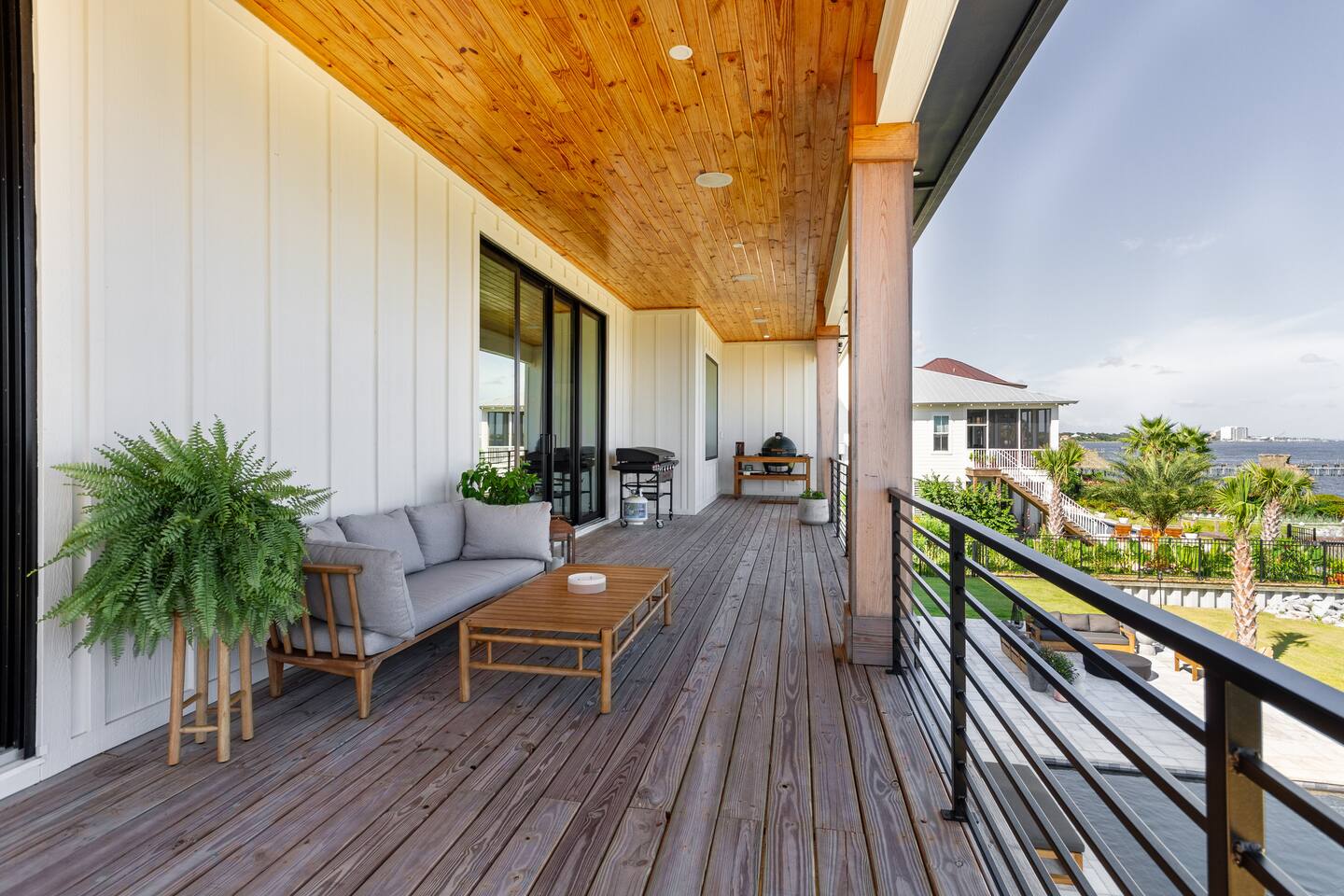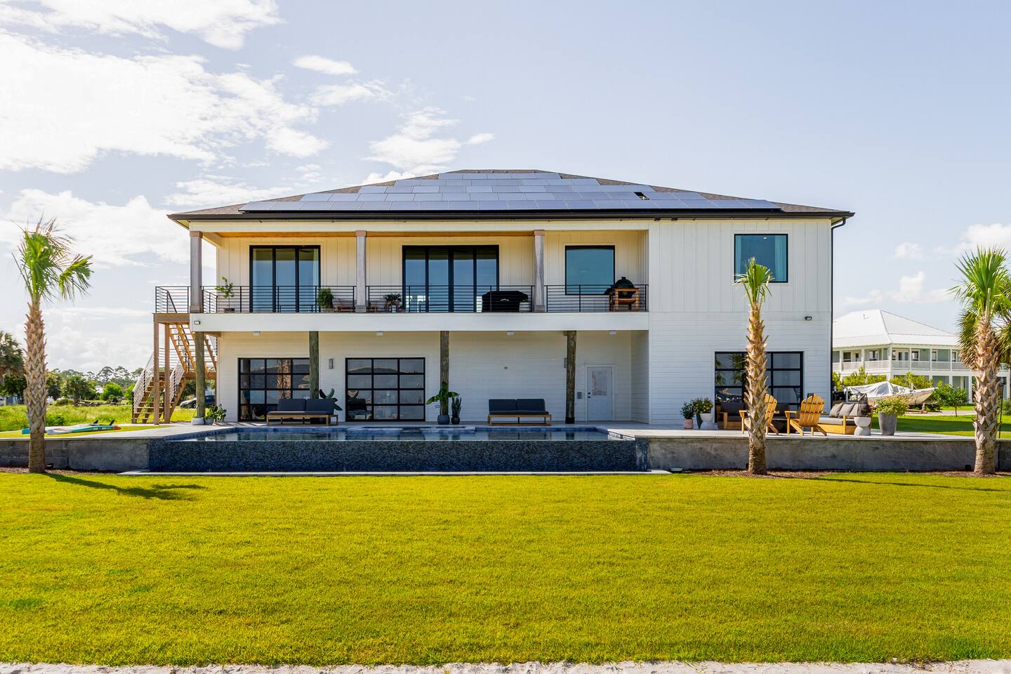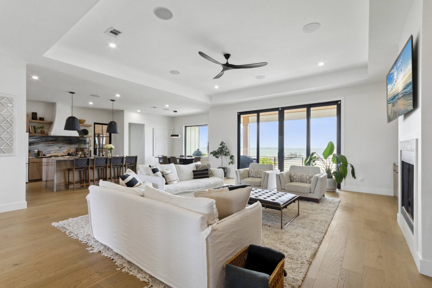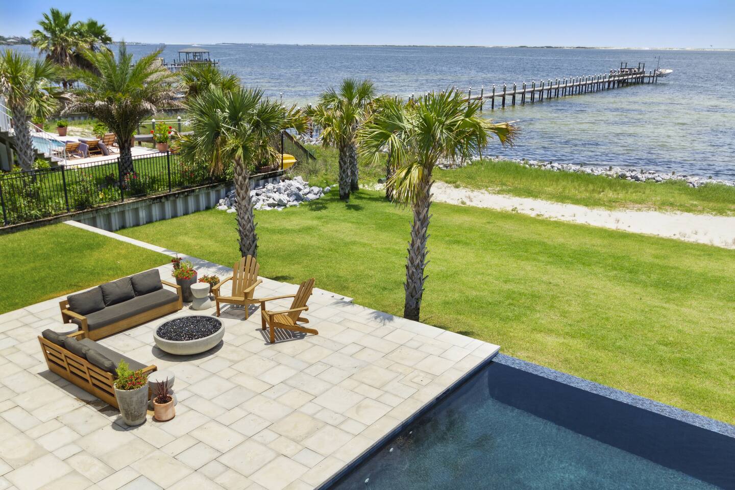 Our stunning 5000 square foot new waterfront home features open concept living at its finest. The spacious gourmet kitchen is equipped with a Big Green Egg and Blackstone grilling options, providing everything you need for cooking a gourmet meal. The beautiful living room offers a gas fireplace, flat screen TV, and comfy seating. The home includes four spacious bedrooms with luxury bedding and large picture windows. The master ensuite bath looks like it should be in a magazine, with its beautiful tadelakt walls, walk-in shower with teak floors, and garden tub, as well as an electric fireplace in the master suite. The property also features a stunning private office, a baby grand piano, and a boat slip to tie up your boat. If you are lucky enough to stay at our home on Tuesdays or Thursdays, you may even get to see the Blue Angels practice overhead. It's an amazing sight to see and hear. Additionally, you won't want to miss the frequent dolphins that pass by. Watch for them in the early mornings and evenings.