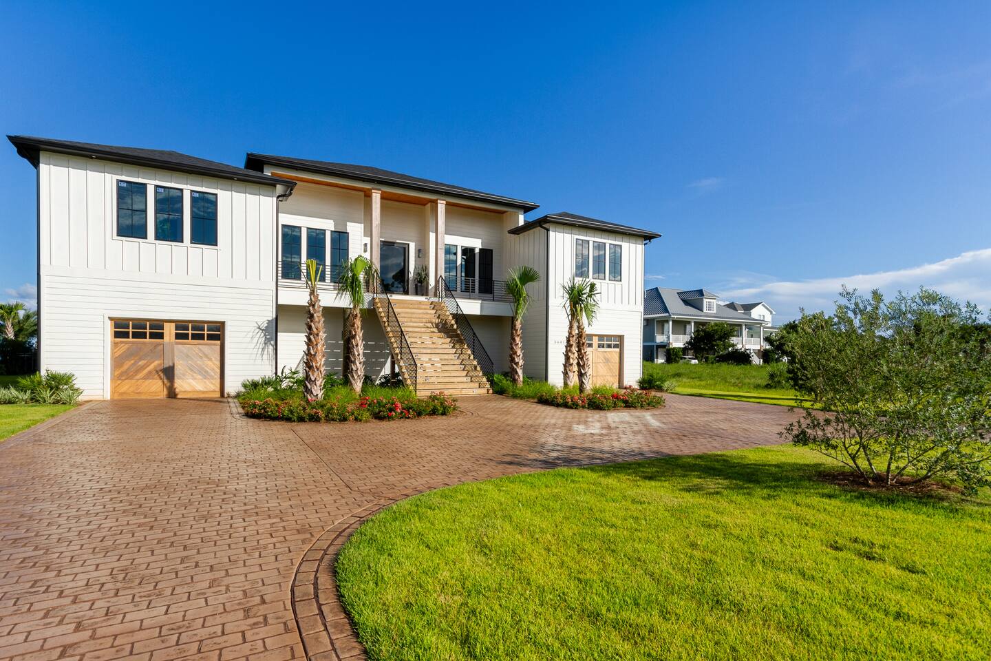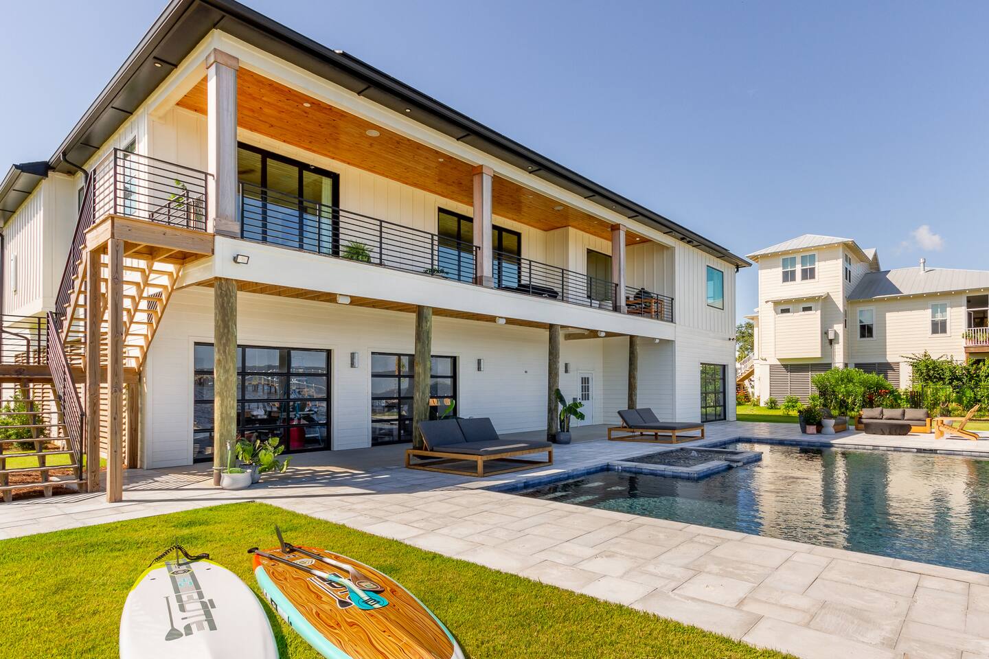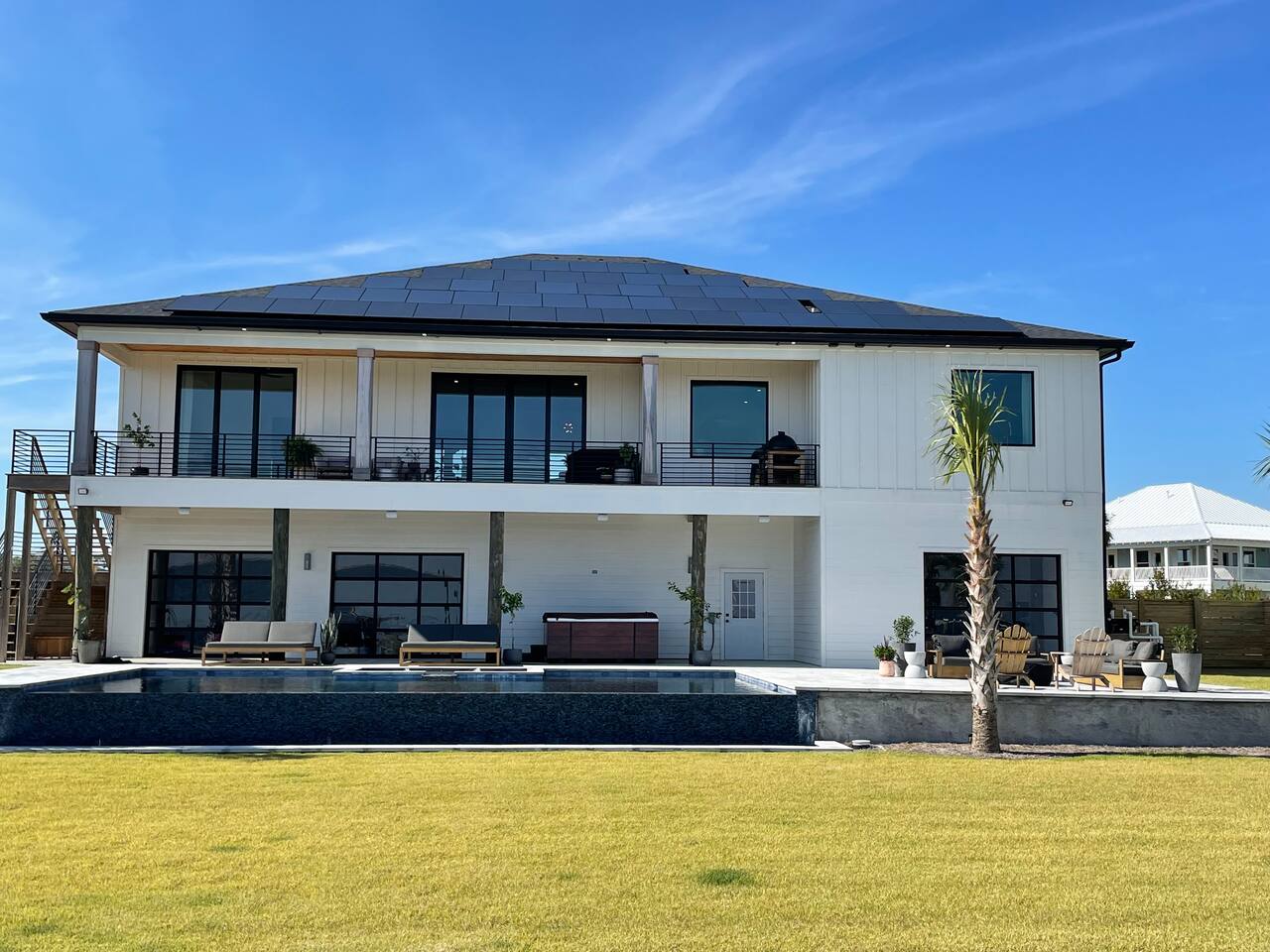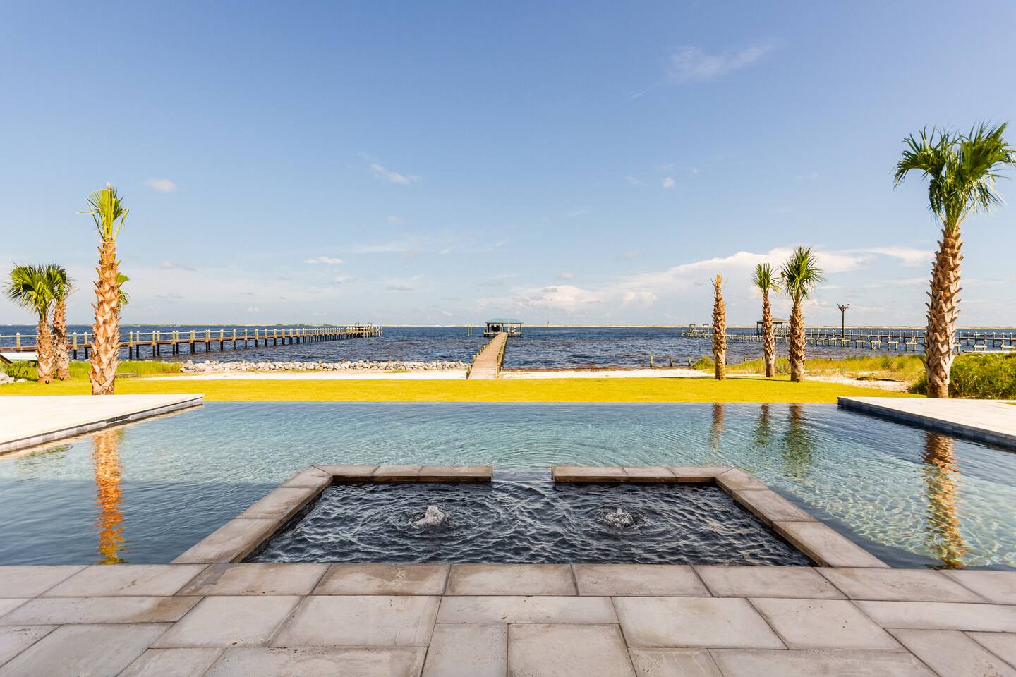 Our stunning 5000 square foot new waterfront home features open concept living at its finest. The spacious gourmet kitchen is equipped with a Big Green Egg and Blackstone grilling options, providing everything you need for cooking a gourmet meal. The beautiful living room offers a gas fireplace, flat screen TV, and comfy seating. The home includes four spacious bedrooms with luxury bedding and large picture windows. The master ensuite bath looks like it should be in a magazine, with its beautiful tadelakt walls, walk-in shower with teak floors, and garden tub, as well as an electric fireplace in the master suite. The property also features a stunning private office, a baby grand piano, and a boat slip to tie up your boat. If you are lucky enough to stay at our home on Tuesdays or Thursdays, you may even get to see the Blue Angels practice overhead. It's an amazing sight to see and hear. Additionally, you won't want to miss the frequent dolphins that pass by. Watch for them in the early mornings and evenings.
