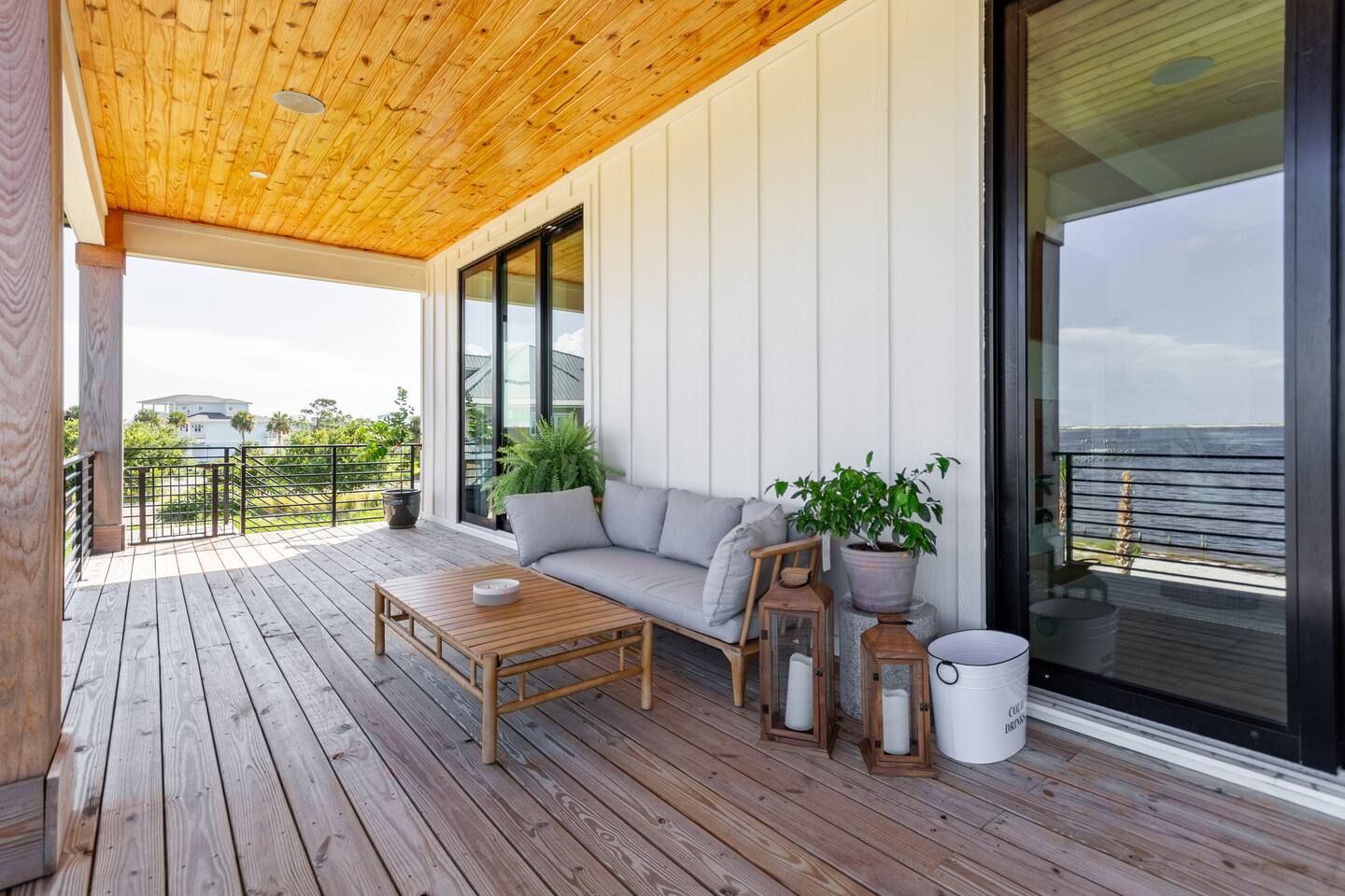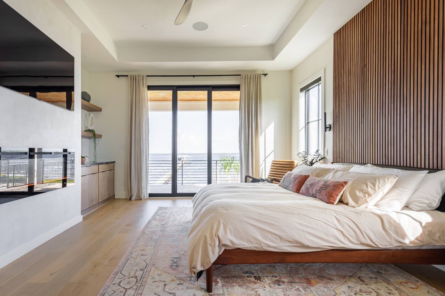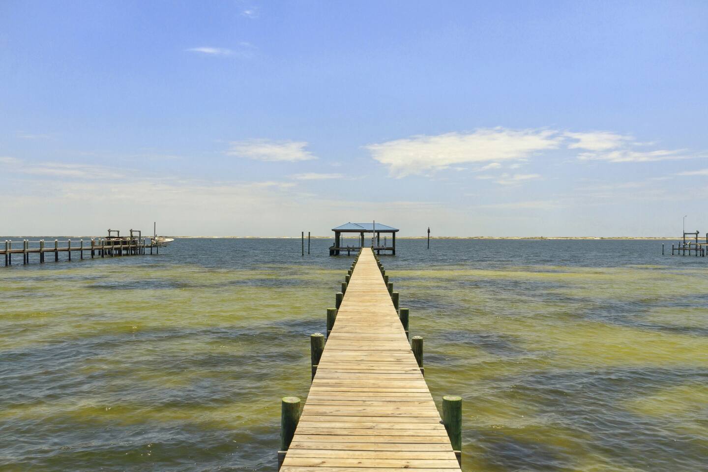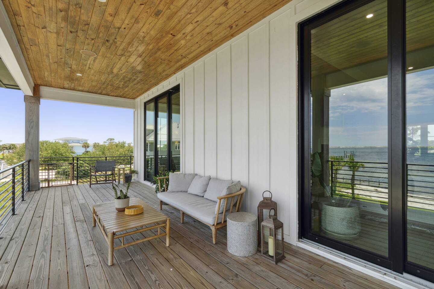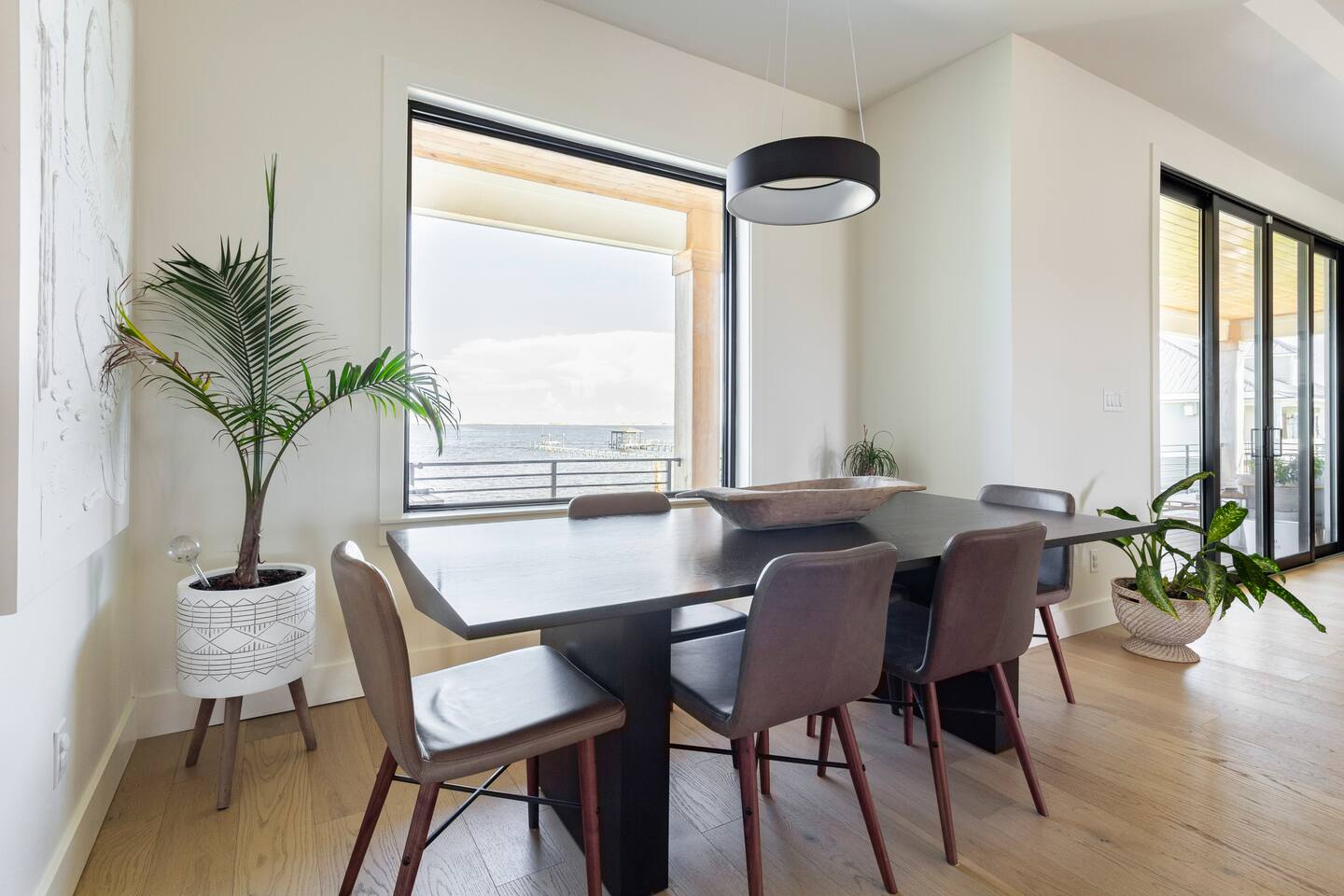 Our stunning 5000 square foot new waterfront home features open concept living at its finest. The spacious gourmet kitchen is equipped with a Big Green Egg and Blackstone grilling options, providing everything you need for cooking a gourmet meal. The beautiful living room offers a gas fireplace, flat screen TV, and comfy seating. The home includes four spacious bedrooms with luxury bedding and large picture windows. The master ensuite bath looks like it should be in a magazine, with its beautiful tadelakt walls, walk-in shower with teak floors, and garden tub, as well as an electric fireplace in the master suite. The property also features a stunning private office, a baby grand piano, and a boat slip to tie up your boat. If you are lucky enough to stay at our home on Tuesdays or Thursdays, you may even get to see the Blue Angels practice overhead. It's an amazing sight to see and hear. Additionally, you won't want to miss the frequent dolphins that pass by. Watch for them in the early mornings and evenings.