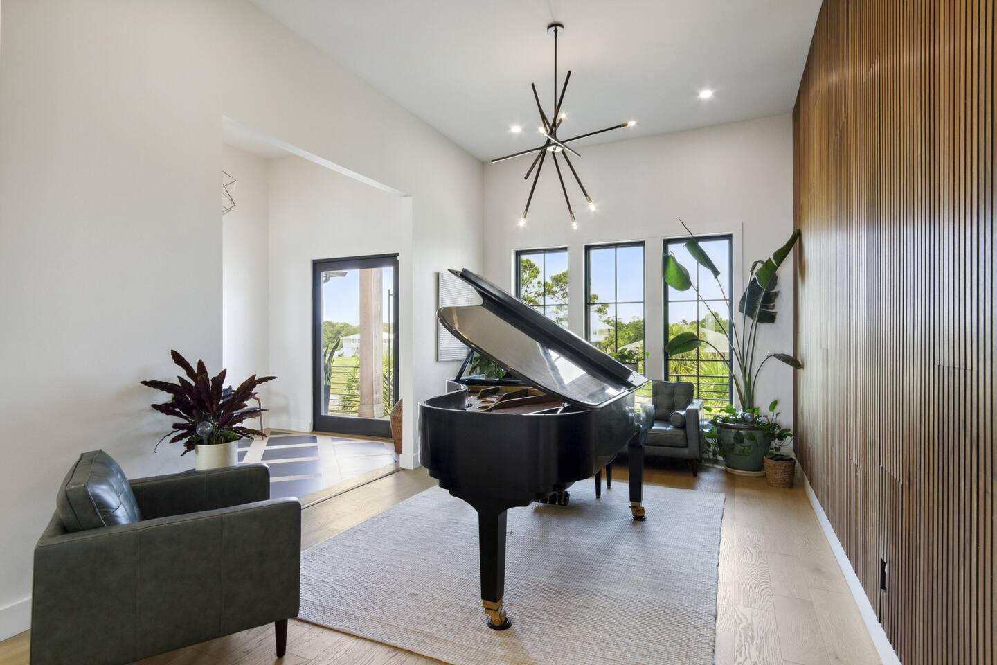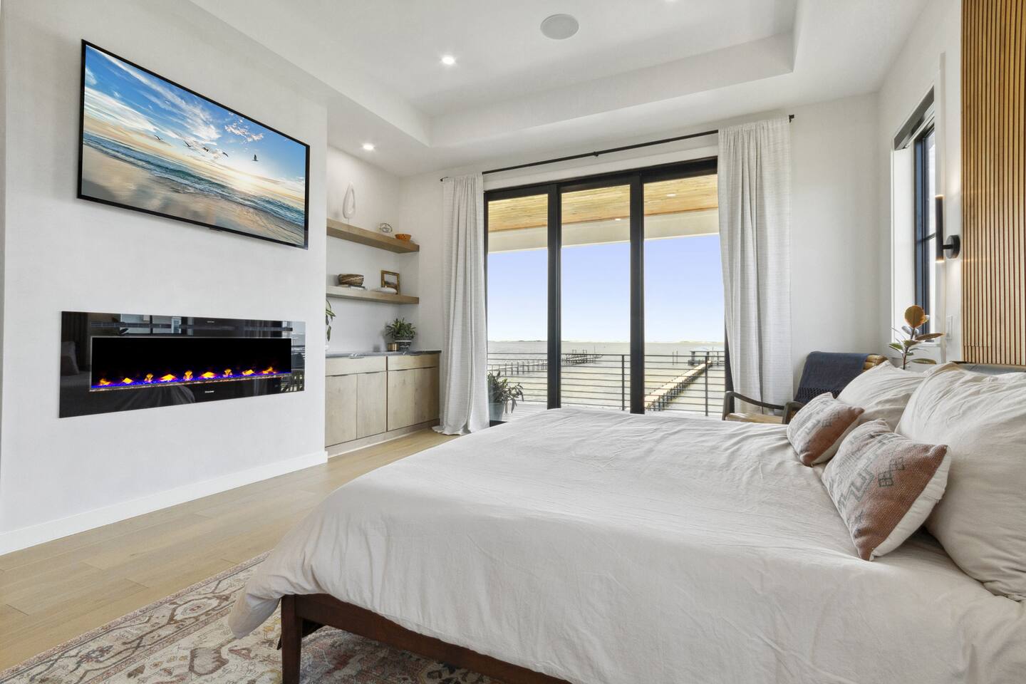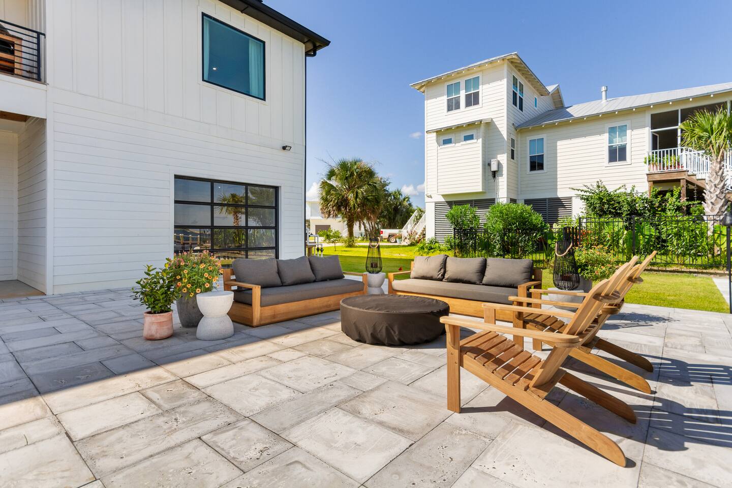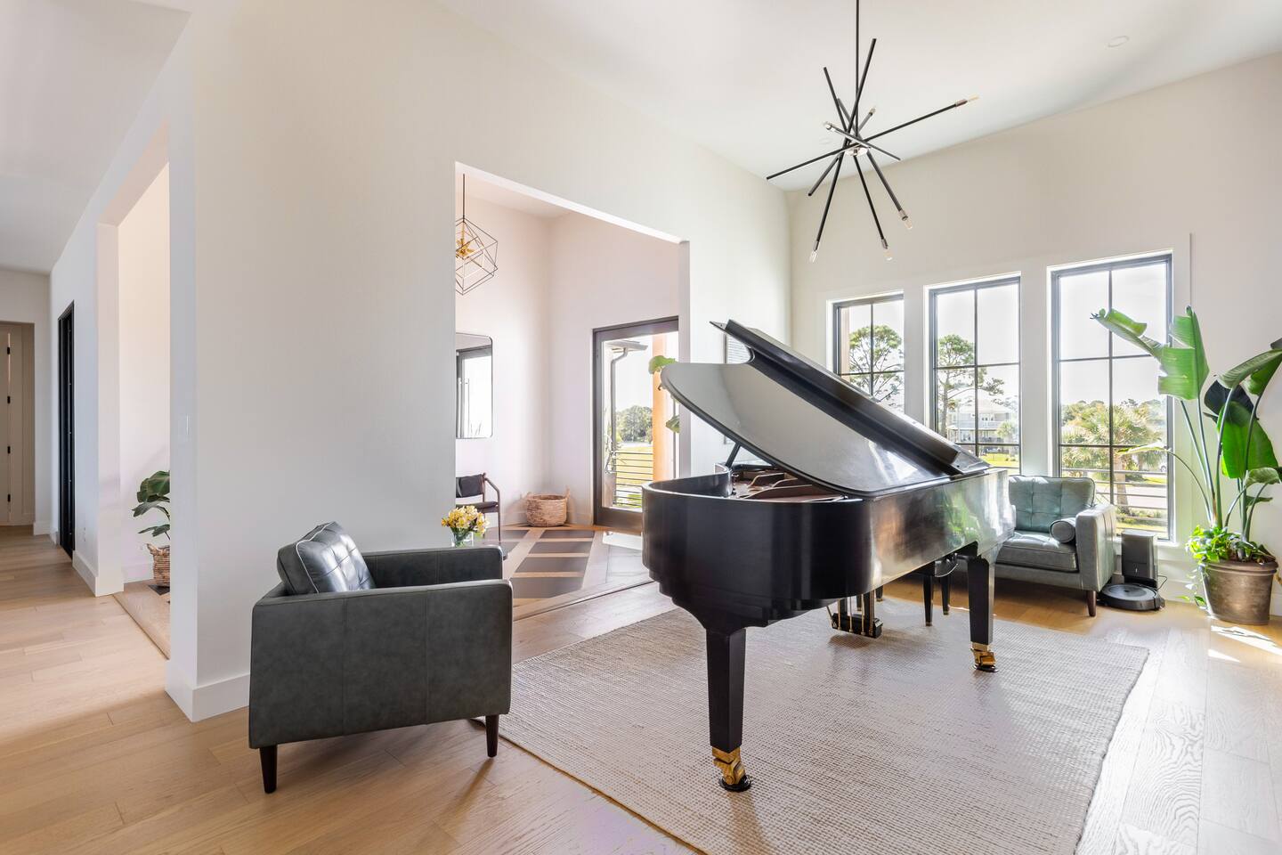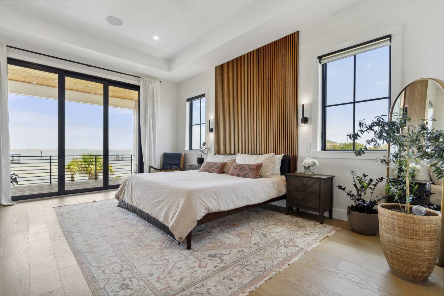 Our stunning 5000 square foot new waterfront home features open concept living at its finest. The spacious gourmet kitchen is equipped with a Big Green Egg and Blackstone grilling options, providing everything you need for cooking a gourmet meal. The beautiful living room offers a gas fireplace, flat screen TV, and comfy seating. The home includes four spacious bedrooms with luxury bedding and large picture windows. The master ensuite bath looks like it should be in a magazine, with its beautiful tadelakt walls, walk-in shower with teak floors, and garden tub, as well as an electric fireplace in the master suite. The property also features a stunning private office, a baby grand piano, and a boat slip to tie up your boat. If you are lucky enough to stay at our home on Tuesdays or Thursdays, you may even get to see the Blue Angels practice overhead. It's an amazing sight to see and hear. Additionally, you won't want to miss the frequent dolphins that pass by. Watch for them in the early mornings and evenings.