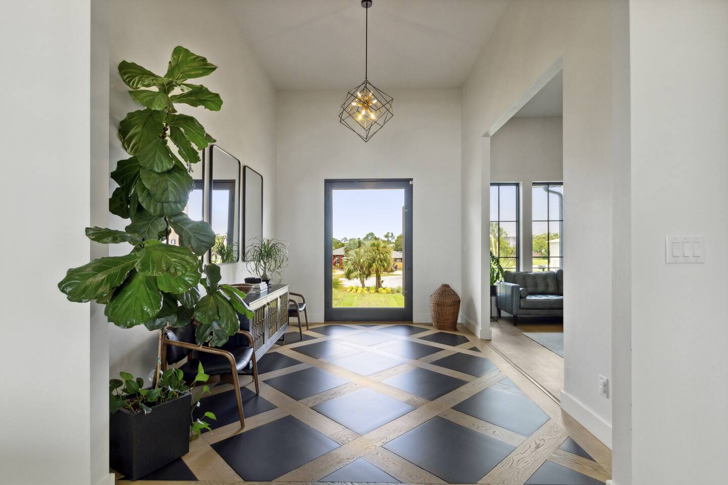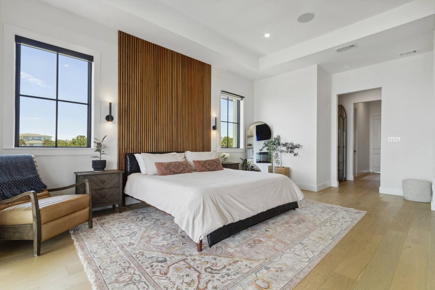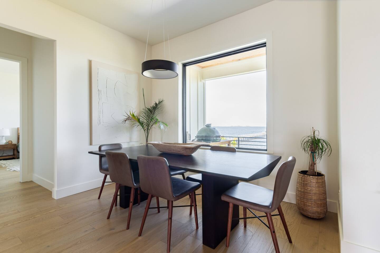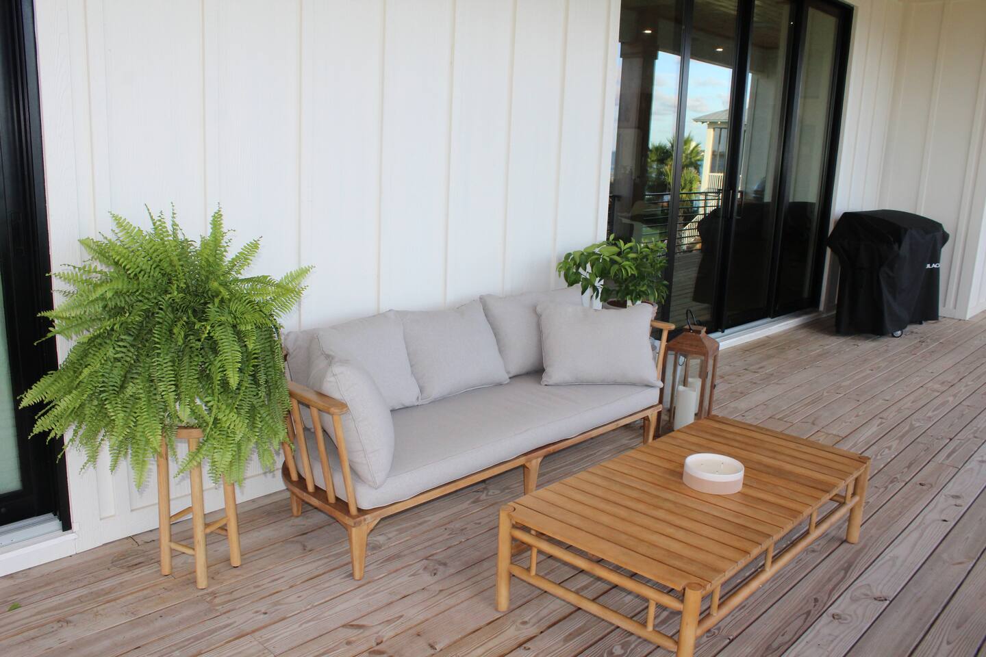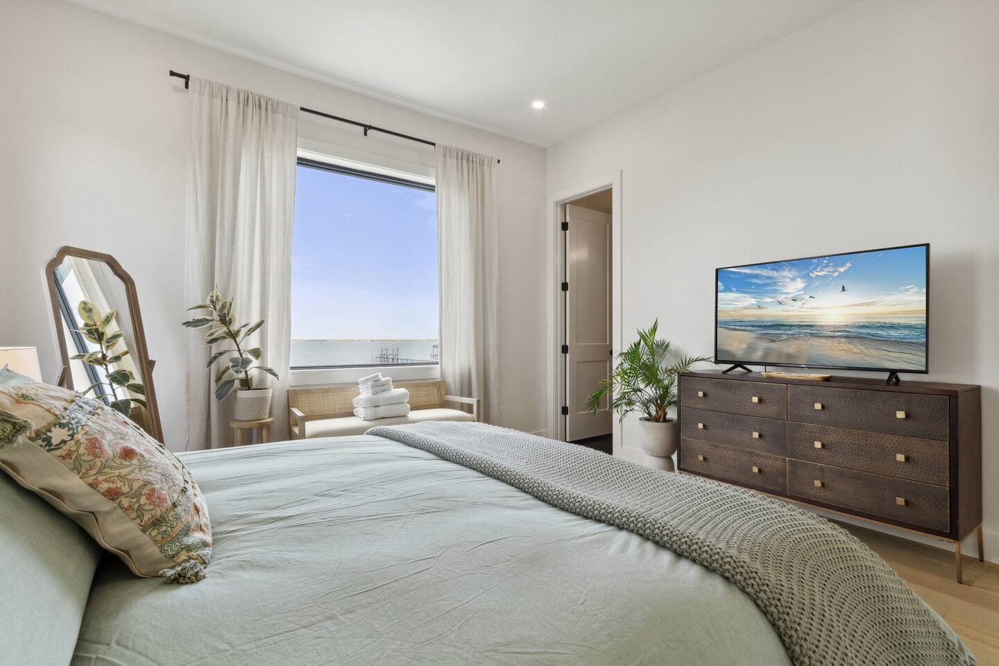 Our stunning 5000 square foot new waterfront home features open concept living at its finest. The spacious gourmet kitchen is equipped with a Big Green Egg and Blackstone grilling options, providing everything you need for cooking a gourmet meal. The beautiful living room offers a gas fireplace, flat screen TV, and comfy seating. The home includes four spacious bedrooms with luxury bedding and large picture windows. The master ensuite bath looks like it should be in a magazine, with its beautiful tadelakt walls, walk-in shower with teak floors, and garden tub, as well as an electric fireplace in the master suite. The property also features a stunning private office, a baby grand piano, and a boat slip to tie up your boat. If you are lucky enough to stay at our home on Tuesdays or Thursdays, you may even get to see the Blue Angels practice overhead. It's an amazing sight to see and hear. Additionally, you won't want to miss the frequent dolphins that pass by. Watch for them in the early mornings and evenings.