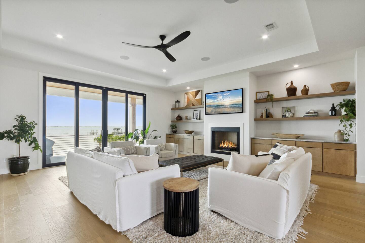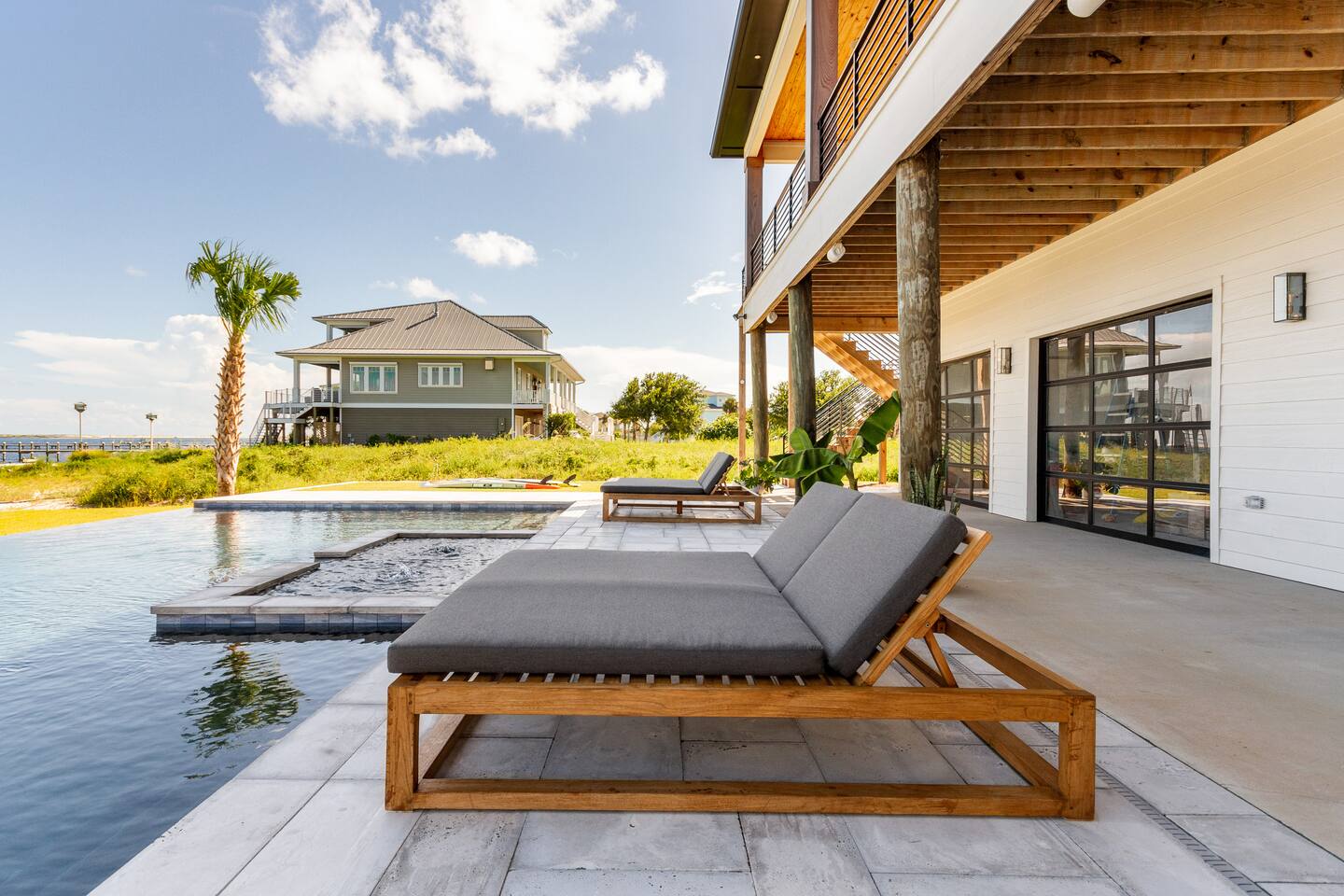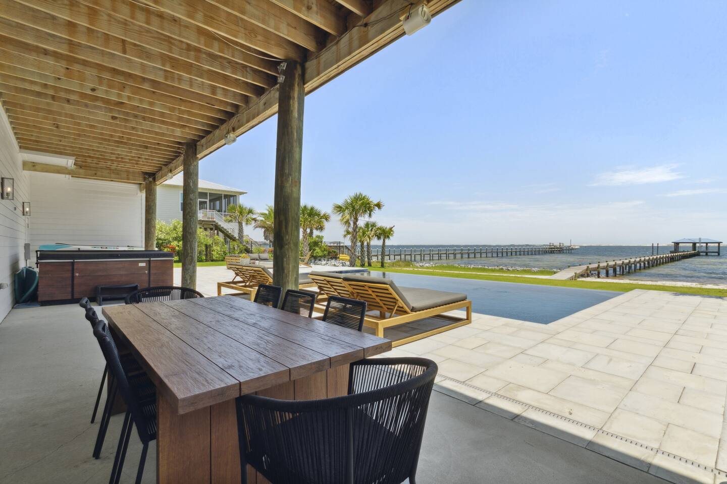Enjoy our beautiful waterfront oasis featuring a custom infinity edge pool, hot tub, firepit, and plenty of places to lounge. Play on our private beach, go paddleboarding or jump off the dock into the clear inter-coastal waters. Large windows offer spectacular views from every room in the house. Open floor plan living ensures you can easily spend quality time together while taking in the breathtaking view.
