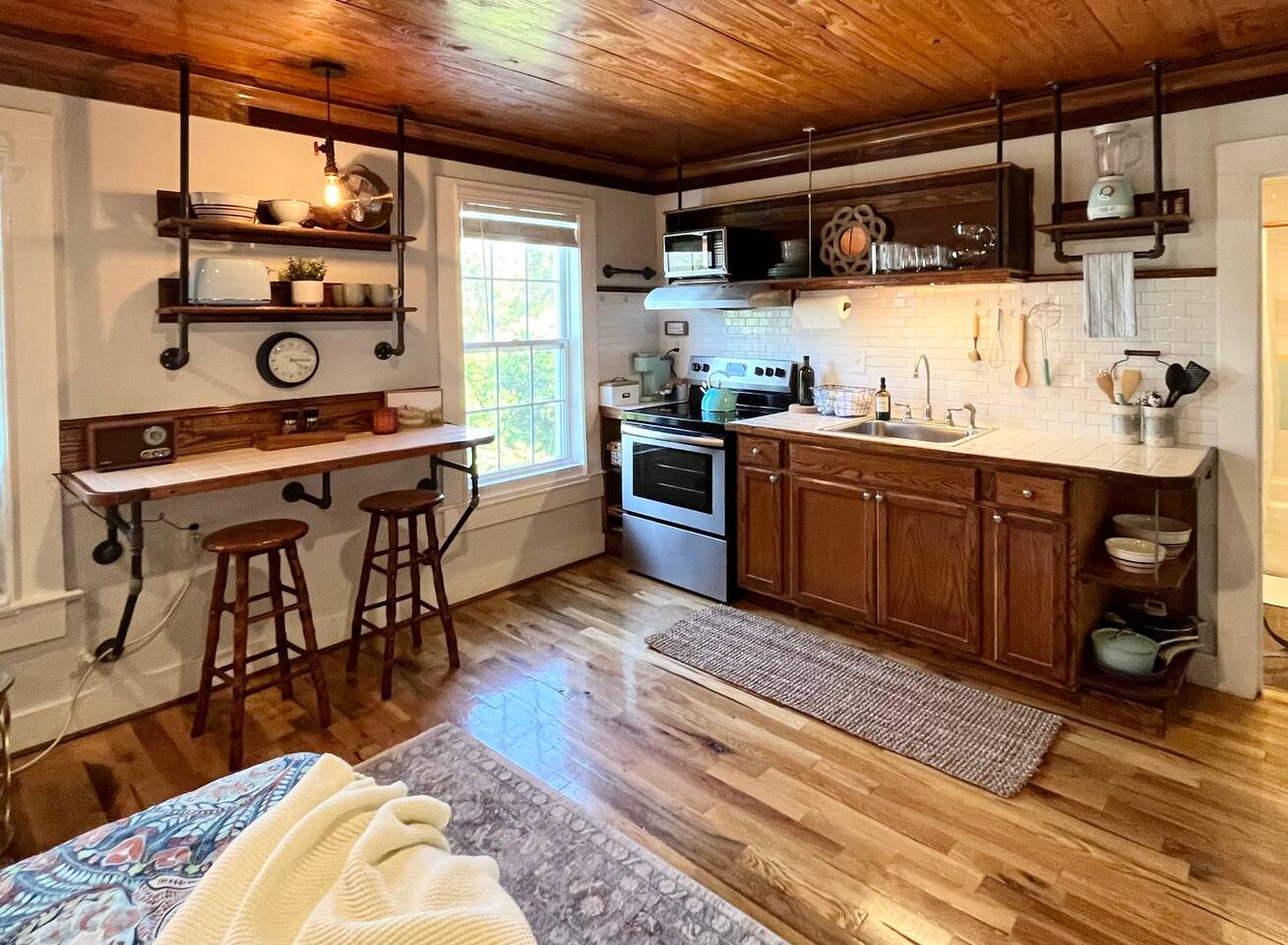 This is a cozy studio apartment. Included is a full kitchen and bathroom along with a seating area and queen sized bed. Smart TVs are provided. Guests must log into their own streaming services for viewing. TVs are set up in guest mode which facilitates easy log in and log out for guests.