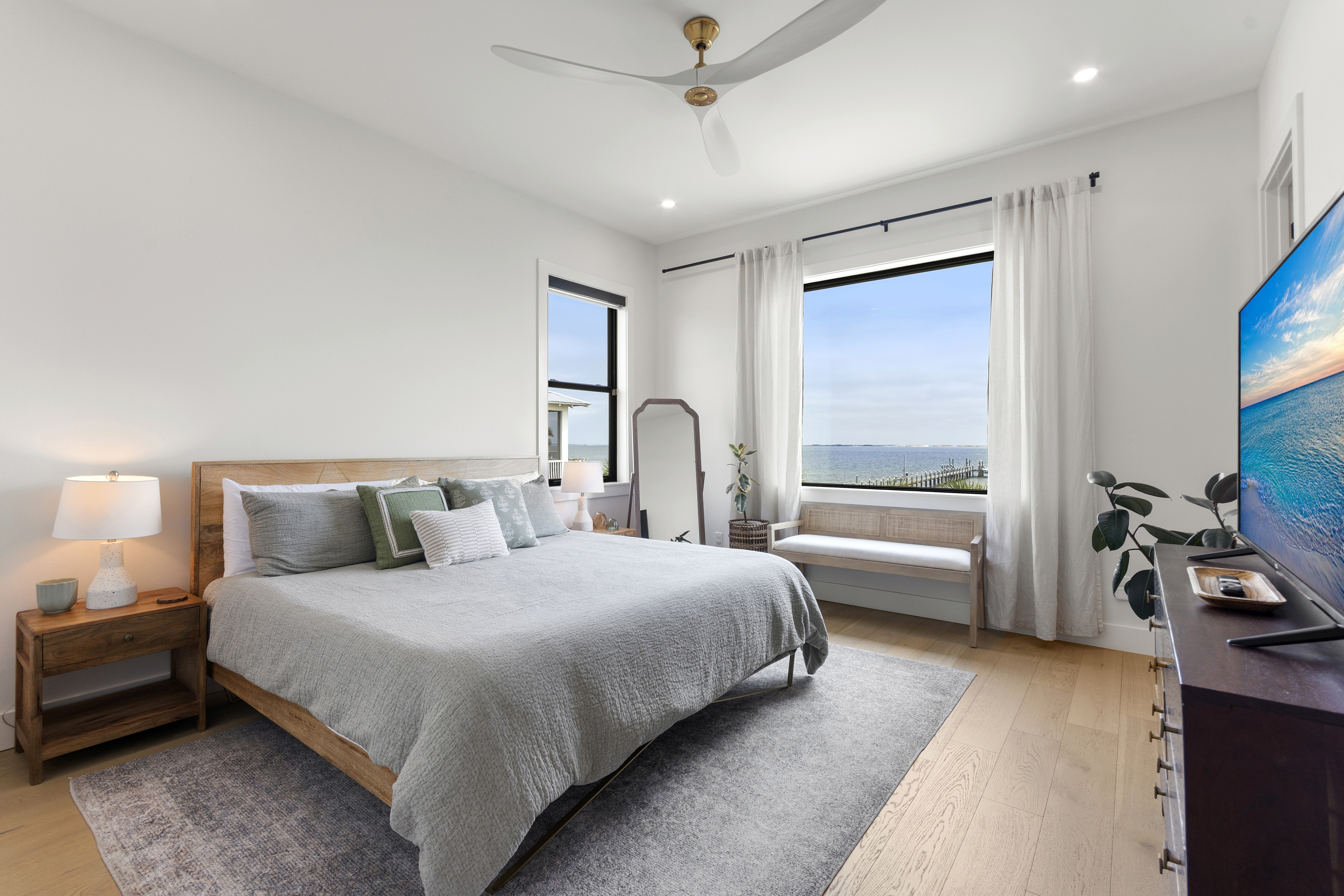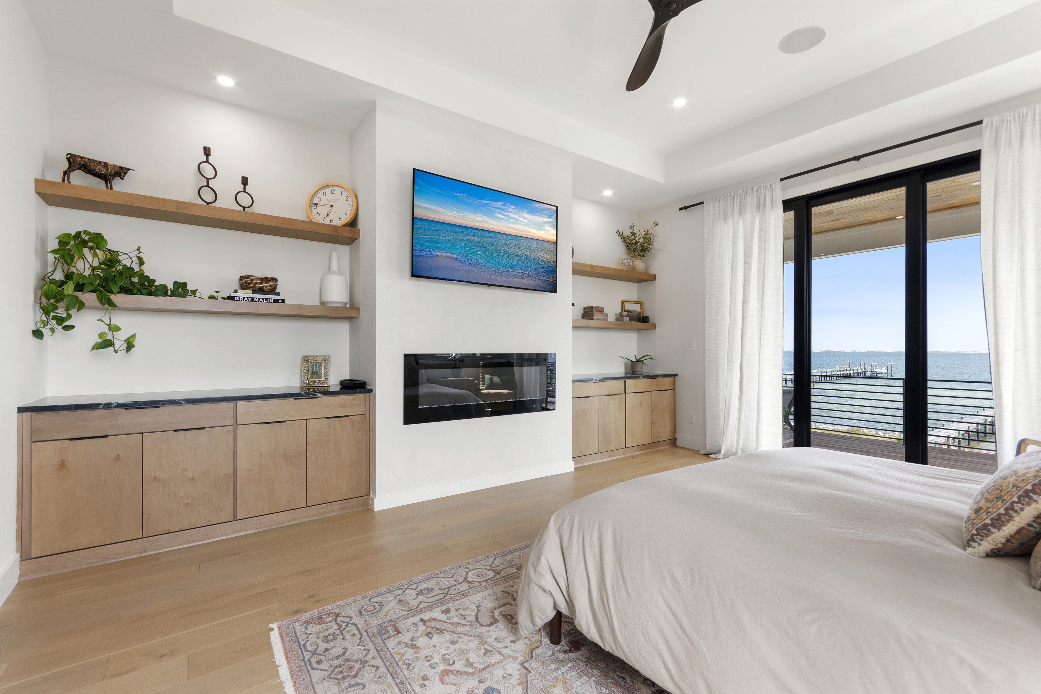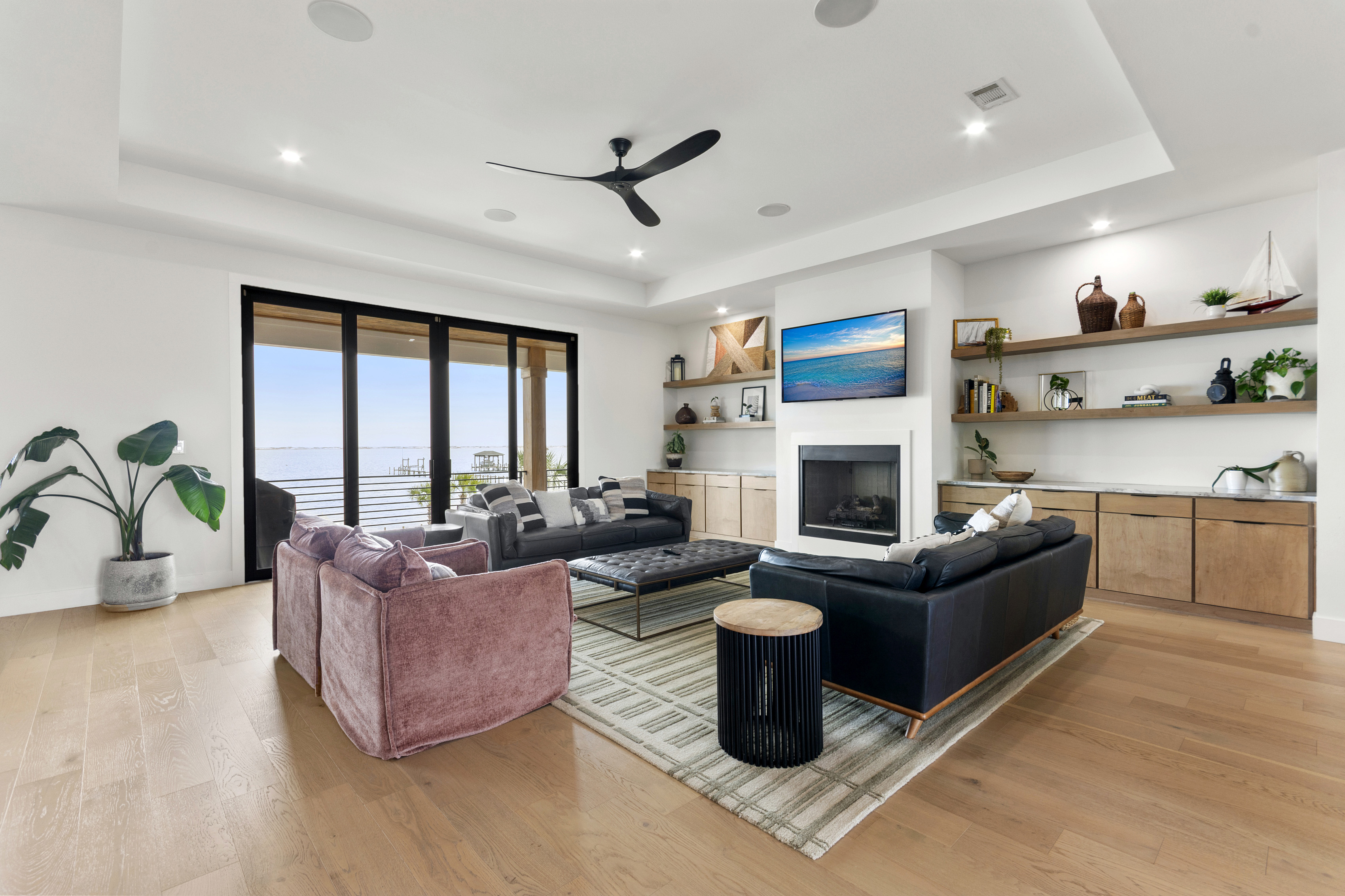 Our stunning 5000 square foot new waterfront home features open concept living at its finest. The spacious gourmet kitchen is equipped with a Big Green Egg and Blackstone grilling options, providing everything you need for cooking a gourmet meal. The beautiful living room offers a gas fireplace, flat screen TV, and comfy seating. The home includes four spacious bedrooms with luxury bedding and large picture windows. The master ensuite bath looks like it should be in a magazine, with its beautiful tadelakt walls, walk-in shower with teak floors, and garden tub, as well as an electric fireplace in the master suite. The property also features a stunning private office, a baby grand piano, and a boat slip to tie up your boat. If you are lucky enough to stay at our home on Tuesdays or Thursdays, you may even get to see the Blue Angels practice overhead. It's an amazing sight to see and hear. Additionally, you won't want to miss the frequent dolphins that pass by. Watch for them in the early mornings and evenings.