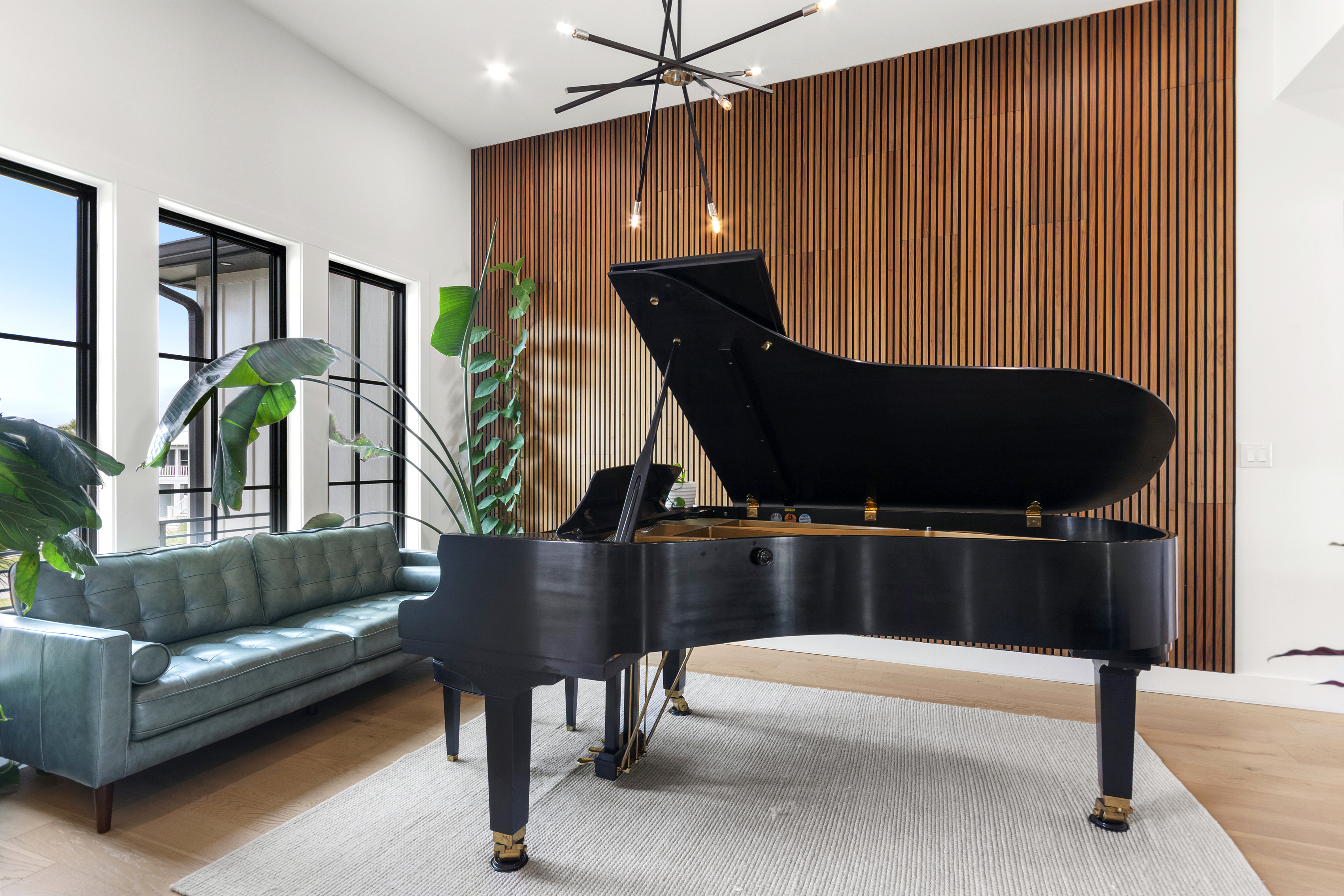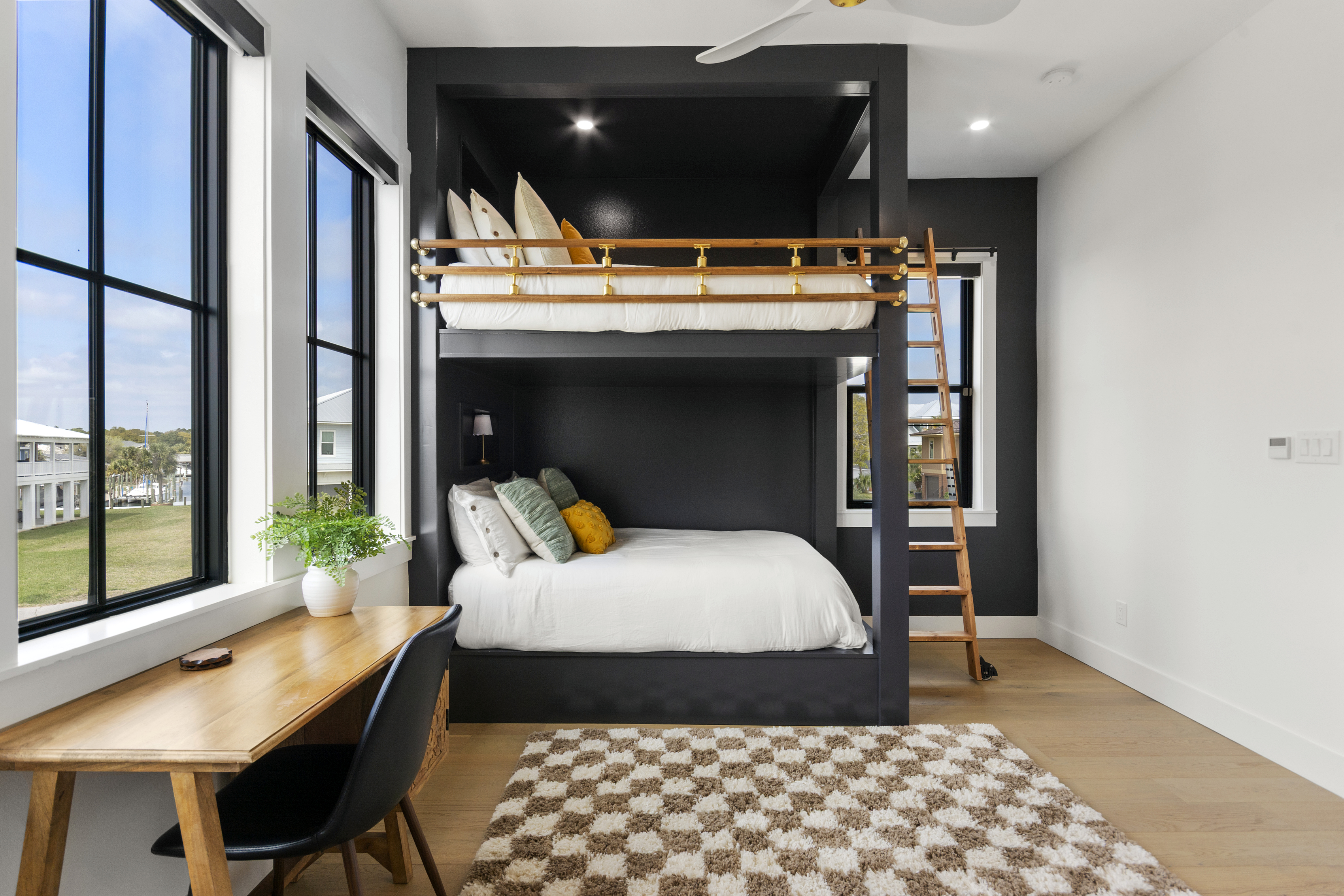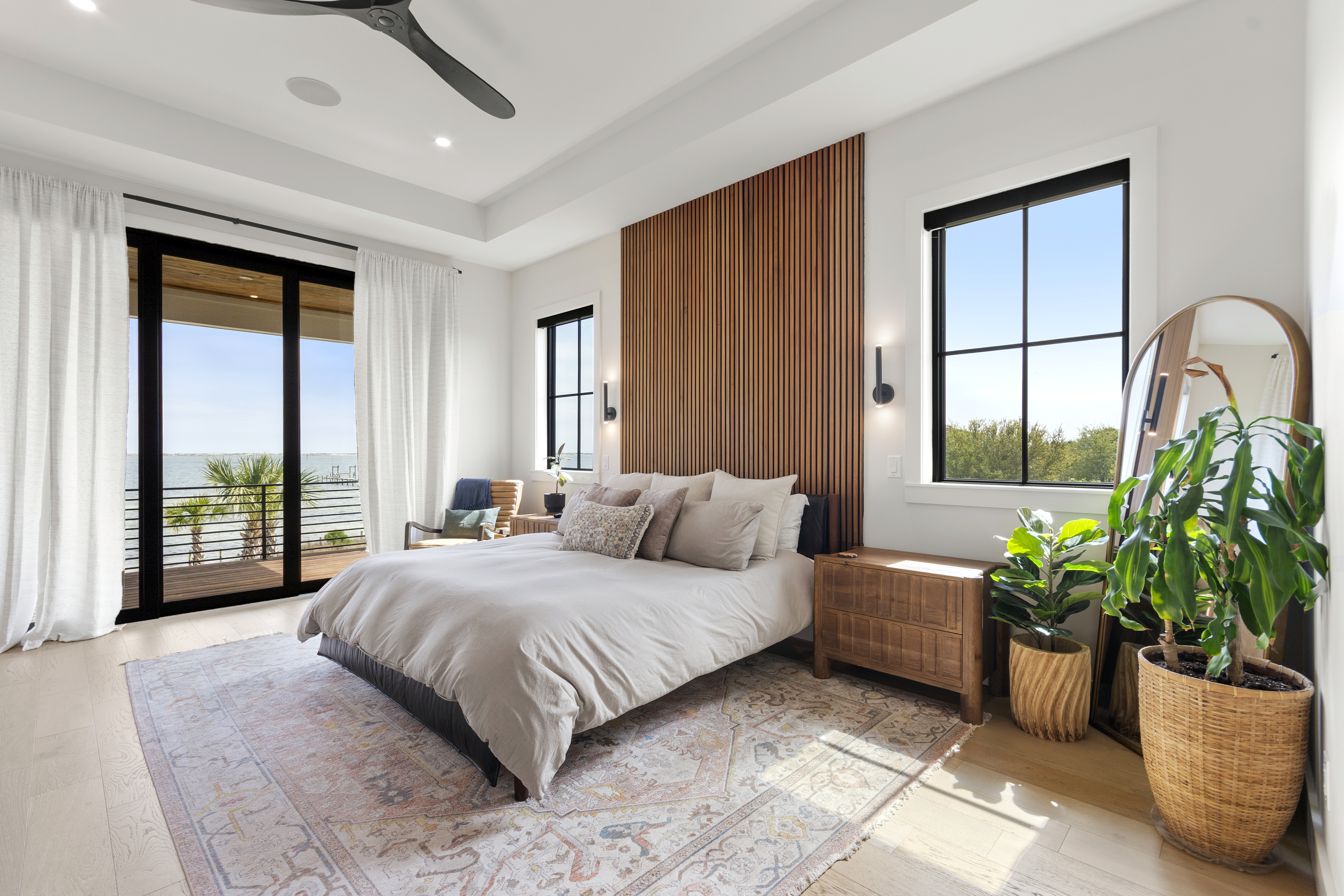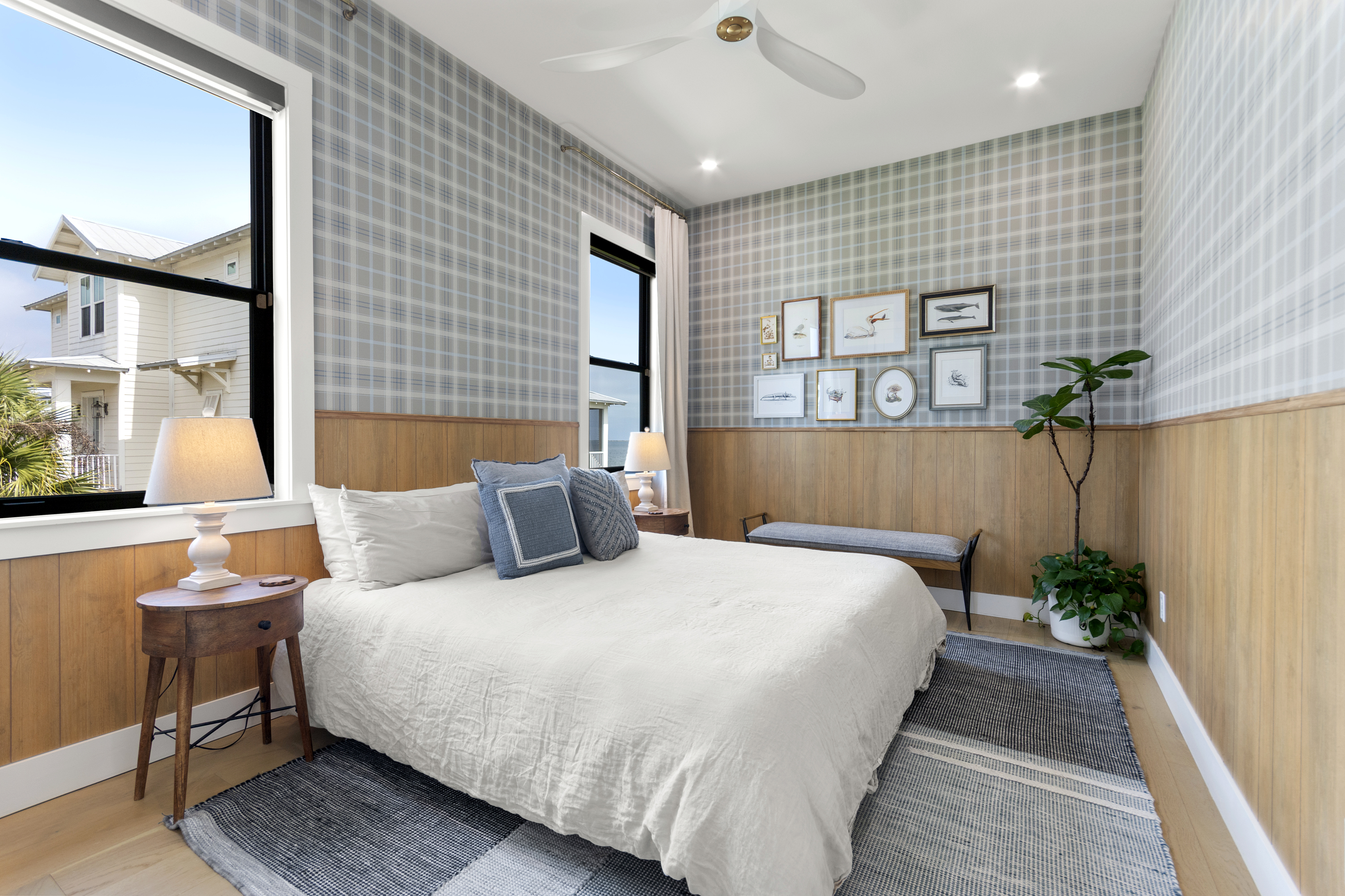 Our stunning 5000 square foot new waterfront home features open concept living at its finest. The spacious gourmet kitchen is equipped with a Big Green Egg and Blackstone grilling options, providing everything you need for cooking a gourmet meal. The beautiful living room offers a gas fireplace, flat screen TV, and comfy seating. The home includes four spacious bedrooms with luxury bedding and large picture windows. The master ensuite bath looks like it should be in a magazine, with its beautiful tadelakt walls, walk-in shower with teak floors, and garden tub, as well as an electric fireplace in the master suite. The property also features a stunning private office, a baby grand piano, and a boat slip to tie up your boat. If you are lucky enough to stay at our home on Tuesdays or Thursdays, you may even get to see the Blue Angels practice overhead. It's an amazing sight to see and hear. Additionally, you won't want to miss the frequent dolphins that pass by. Watch for them in the early mornings and evenings.